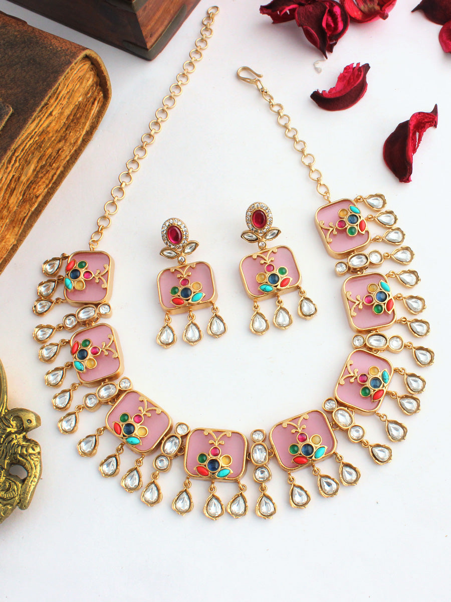 This set is designed to add a touch of glamour to your attire with its simulated polki diamonds, CZs, and vibrant multi-color stones. The adjustable chain ensures a perfect fit, making it an ideal choice for various occasions.