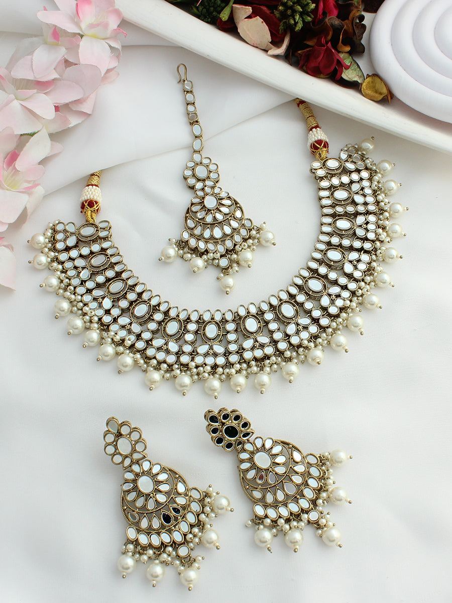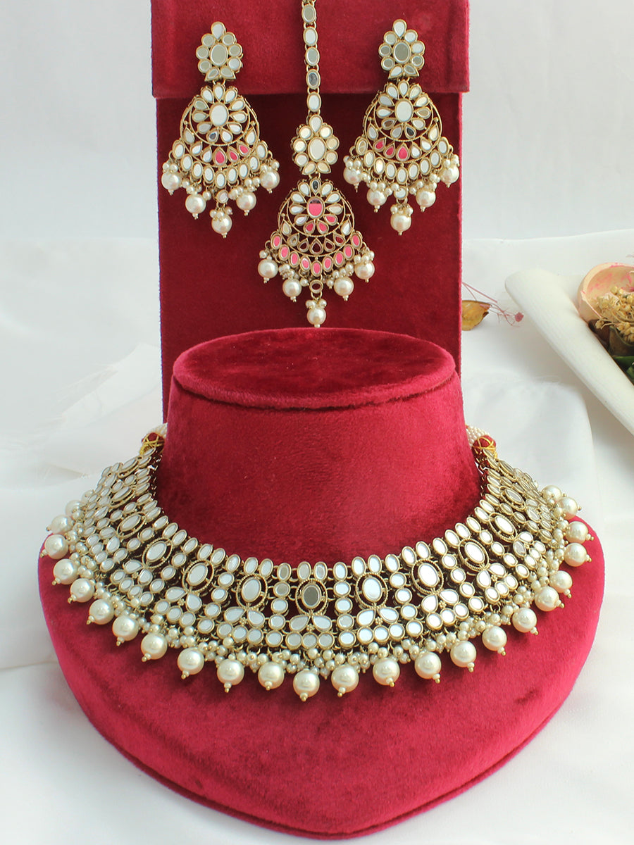 Introducing our gold tone mirror bib necklace set adorned with faux Pearls, mirrors is a breathtaking piece that exudes elegance.