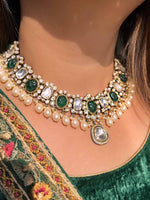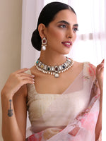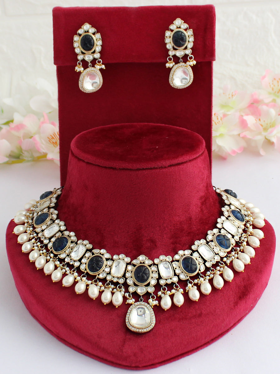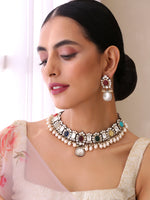 Antique two-tone bib necklace set studded with simulated polki diamonds, multi color carved stones, faux pearls and beads.