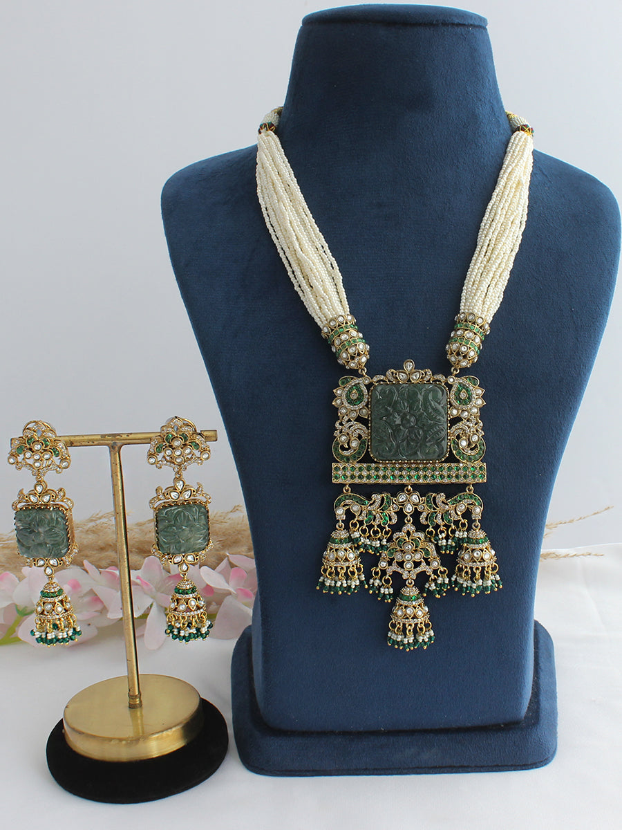 Elevate your style with the Kritisha Necklace Set, a breathtaking piece designed to make you feel like royalty. Handcrafted to perfection, this traditional set is a harmonious blend of elegance, opulence, and heritage craftsmanship. This exquisite piece features a simulated polki diamonds, vibrant CZs hot pink stones, and green carved stones, it features intricate floral detailing that exudes vintage charm. Delicately layered with faux pearls, the necklace offers graceful movement and rich texture, finished in a luxurious antique gold tone that enhances its timeless appeal. Paired with matching statement earrings, this set is perfect for weddings, festive celebrations, or any occasion where you want to leave a lasting impression. The Kritisha Set isn't just jewelry—it's a celebration of tradition, artistry, and timeless beauty.