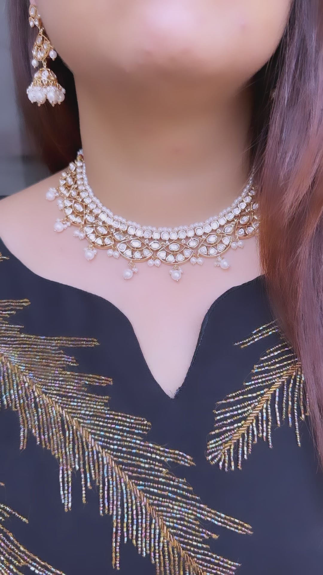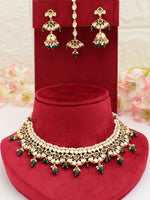 Gold Plated bib necklace set studded with simulated polki diamonds, green stones, faux pearls and beads.