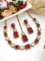 Our Antique Gold Tone Bib Necklace Set, adorned with simulated Diamond Polkis, Czs, Maroon and Green Shattered Stones is a breathtaking piece that exudes elegance.