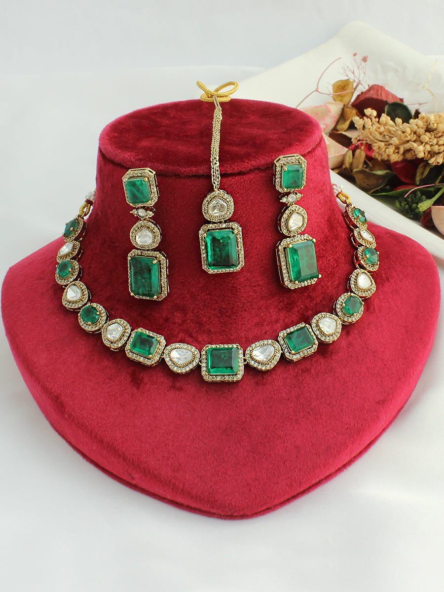 This set is a perfect blend of traditional and contemporary design, making it an ideal choice for any occasions and celebrations. The intricate detailing with Simulated diamond polkis, czs and stones enhances the overall appeal, creating a statement piece that complements various outfits.