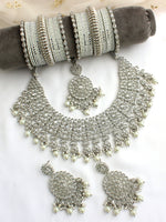The Gold Tone Bib Necklace Set is an exquisite piece adorned with simulated polki and faux pearl beads. NOTE : Bangles Sold Separately