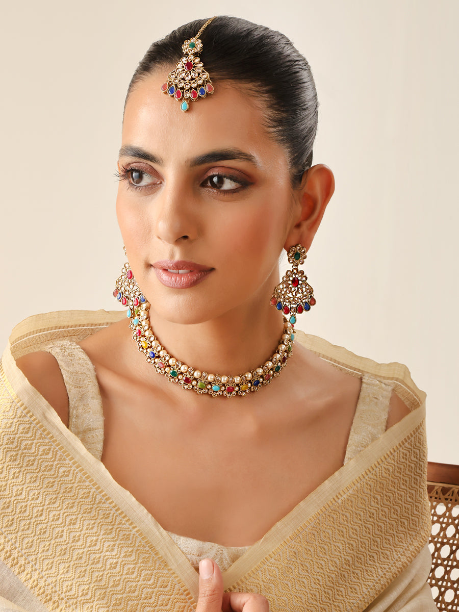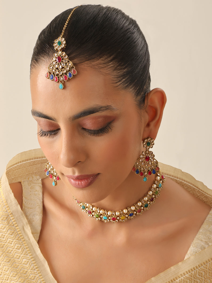 The gold tone bib necklace set is studded with simulated polkis, faux pearls, and multicolor stones. The necklace measures approximately 9 1/4" in length with an adjustable cord fit to all neck sizes. The earrings measure approximately 55mm(L) x 25mm(W) or 2 1/4" (L) x 1" (W) with post back findings for pierced ears. The tikka measures approximately 5 1/4" in length with a width of 25mm or 1". The base is made of high-grade alloy metal.