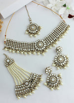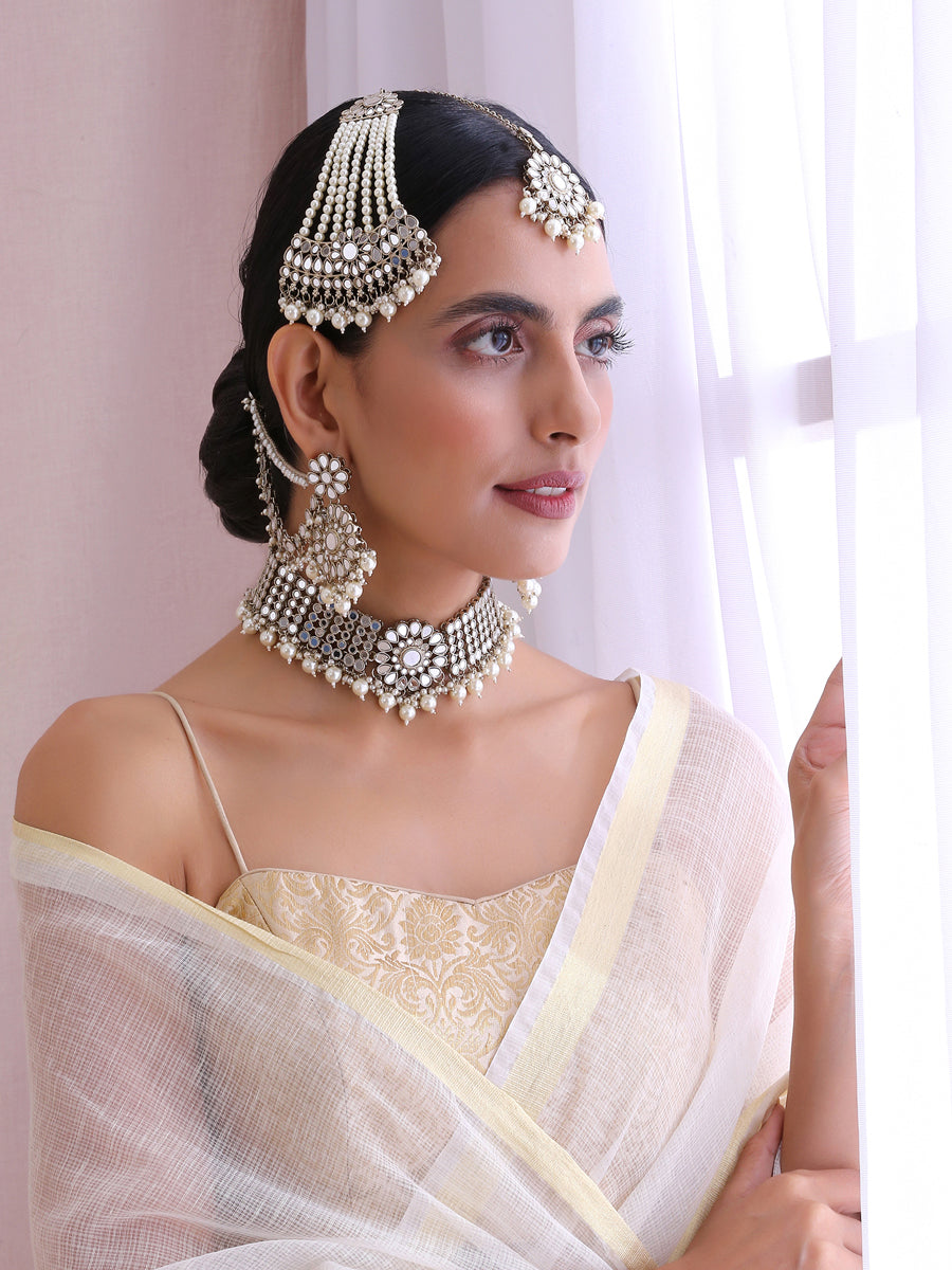 A necklace ensemble adorned with a lustrous gold/silver finish, embellished with mirrors, stones, imitation pearls, assorted colored stones, and beads. Please be advised that the multicolor variant may exhibit variations in colors, stones, and beads. The necklace is approximately 8 inches in length, equipped with an adjustable cord to accommodate all neck sizes. The earrings measure roughly 70mm in length by 35mm in width, or approximately 2 3/4 inches by 1 1/2 inches, featuring post back findings suitable for pierced ears. Ear chain is not included. The tikka spans approximately 6 1/2 inches in length with a width of 50mm (2 inches) on the forehead side. The Jhoomer measures 150mm in length by 80mm in width, or roughly 6 inches by 3 1/4 inches. Material: Crafted from high-grade alloy metal.
