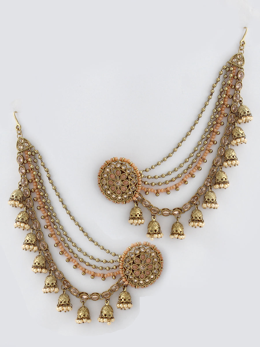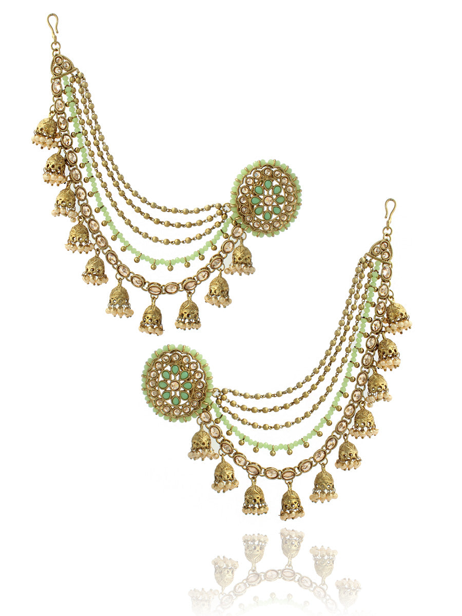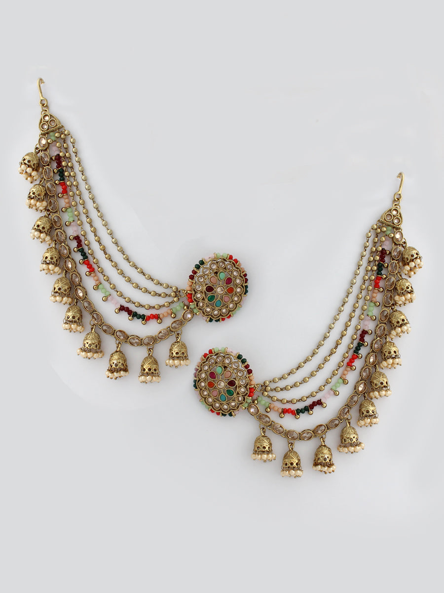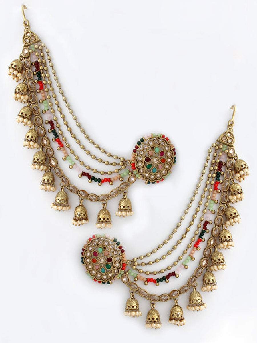 These exquisite stud earrings are designed with intricate detailing, featuring simulated Polkis, CZs, multi-color stones, and beads. The earrings measure approximately 35mm in length and 30mm in width, providing a delicate and charming look. The set includes a 5-layered ear chain that adds a touch of elegance to the overall design. With post back findings for pierced ears, these earrings are not only stylish but also versatile. Additionally, the ear chains are detachable, allowing you to customize your look based on your preference. Crafted from high-grade alloy metal, these gold-tone stud earrings are a perfect choice for various occasions.