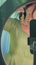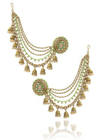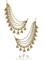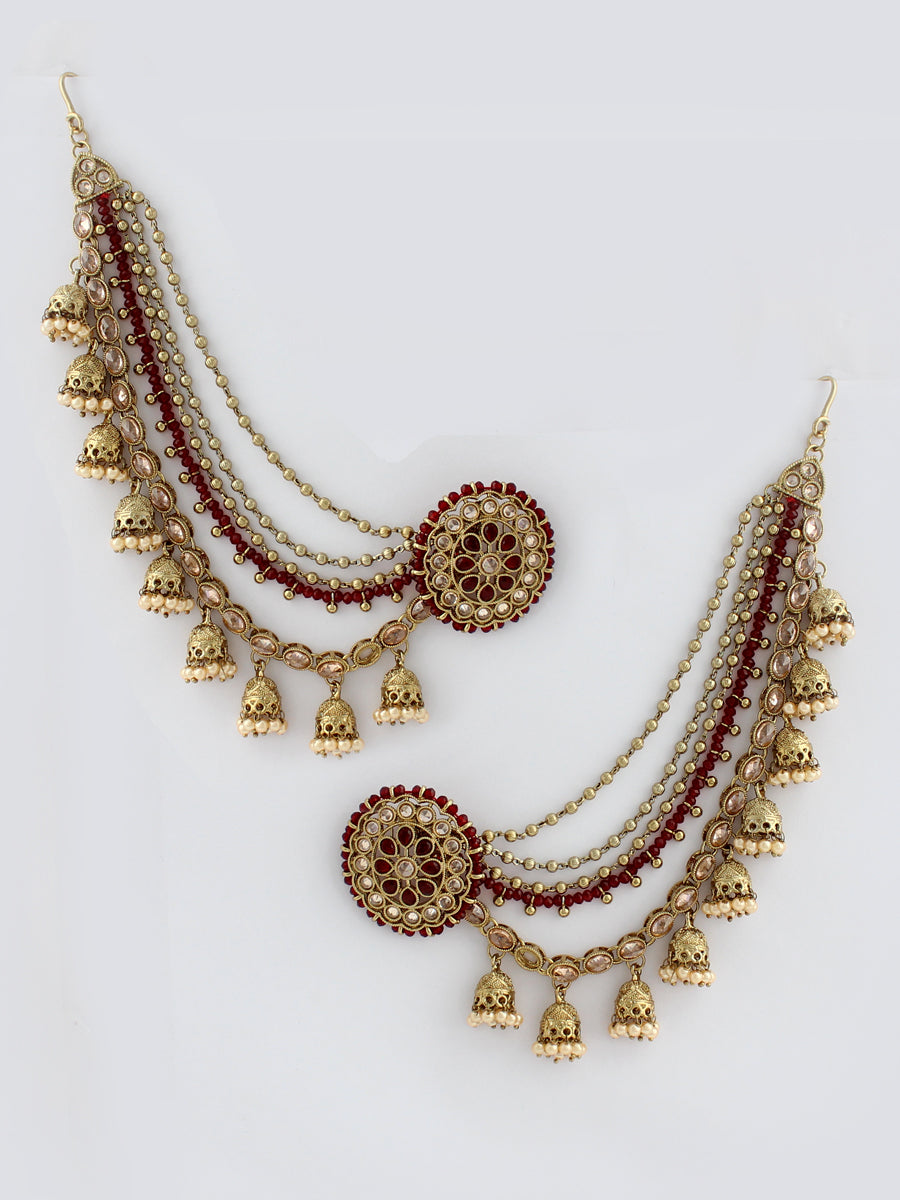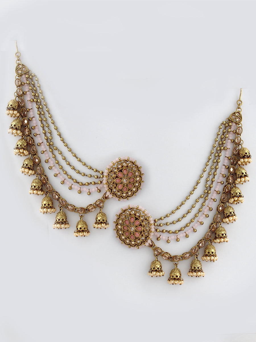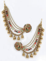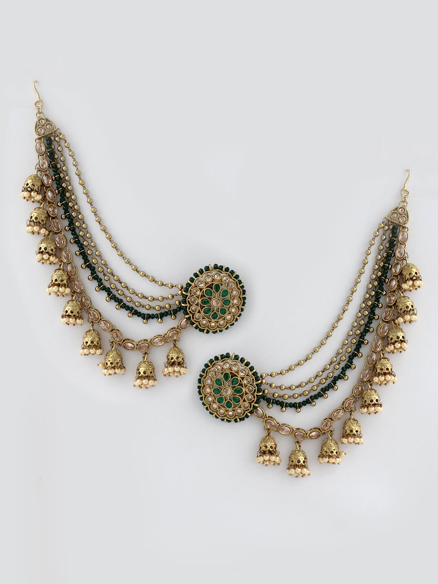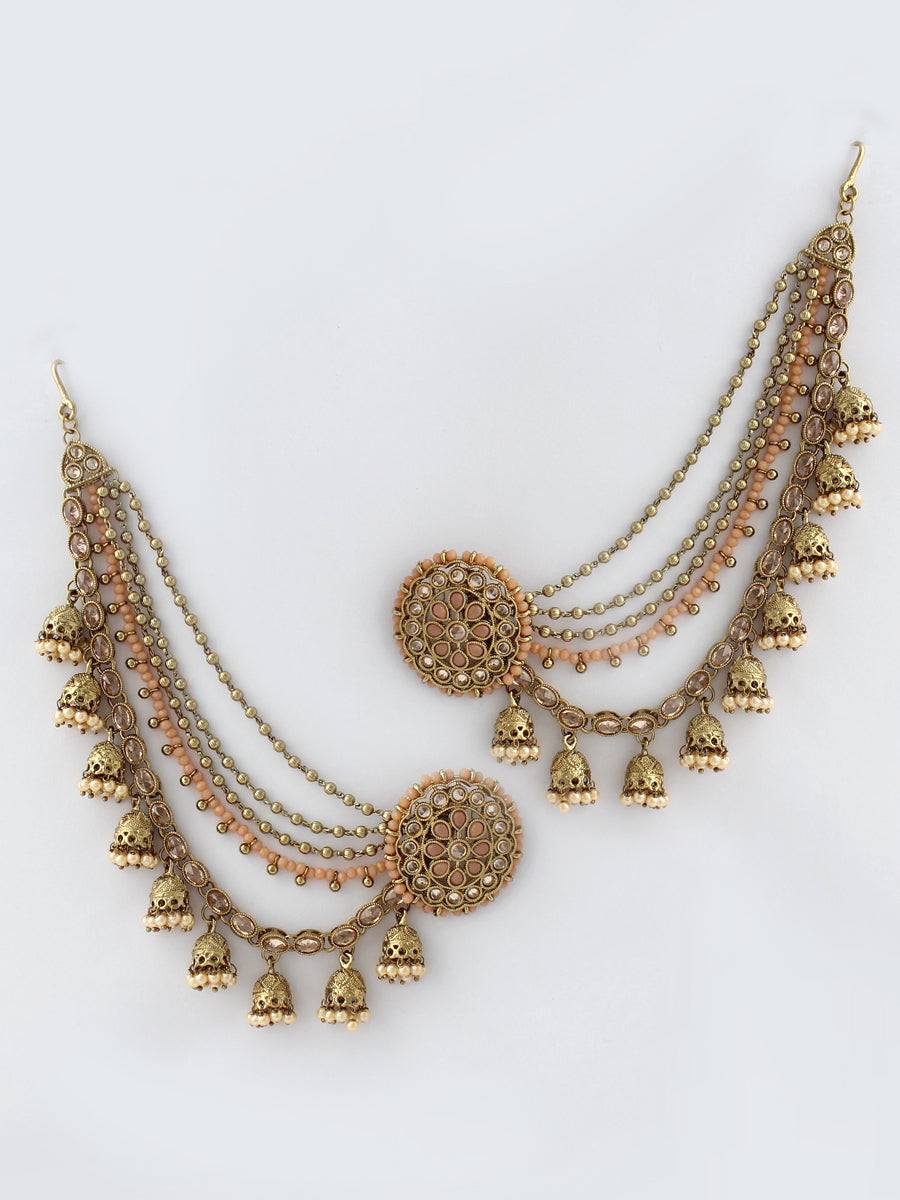 These exquisite stud earrings are designed with intricate detailing, featuring simulated Polkis, CZs, multi-color stones, and beads. The earrings measure approximately 35mm in length and 30mm in width, providing a delicate and charming look. The set includes a 5-layered ear chain that adds a touch of elegance to the overall design. With post back findings for pierced ears, these earrings are not only stylish but also versatile. Additionally, the ear chains are detachable, allowing you to customize your look based on your preference. Crafted from high-grade alloy metal, these gold-tone stud earrings are a perfect choice for various occasions.