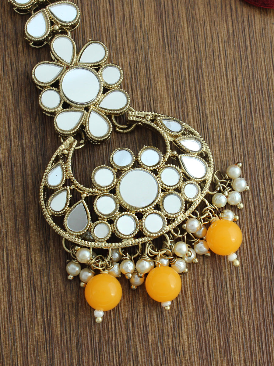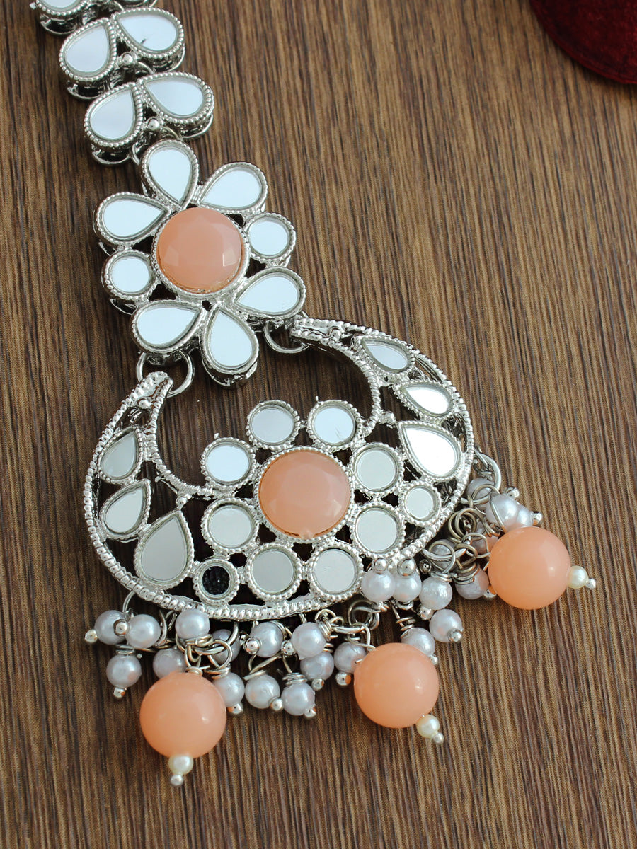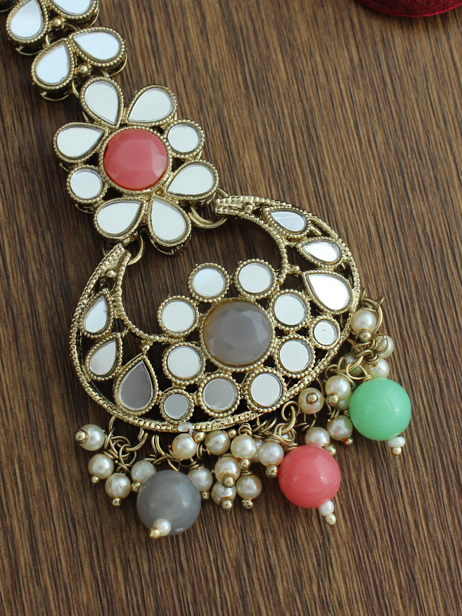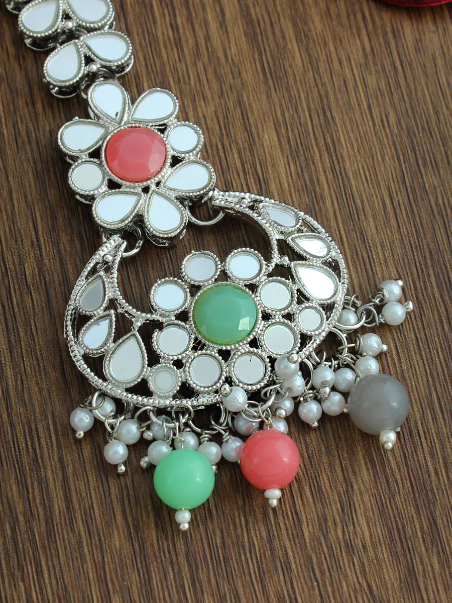 The silver/gold tone maang tikka is embellished with mirrors, multicolored stones, and beads, creating a vibrant and stylish accessory. Here are the specifications: