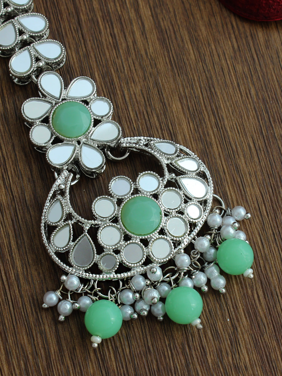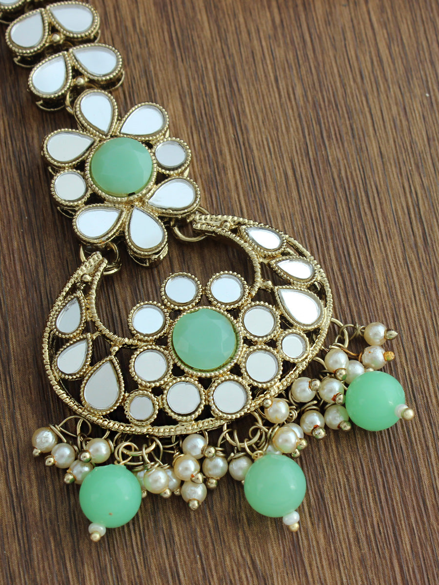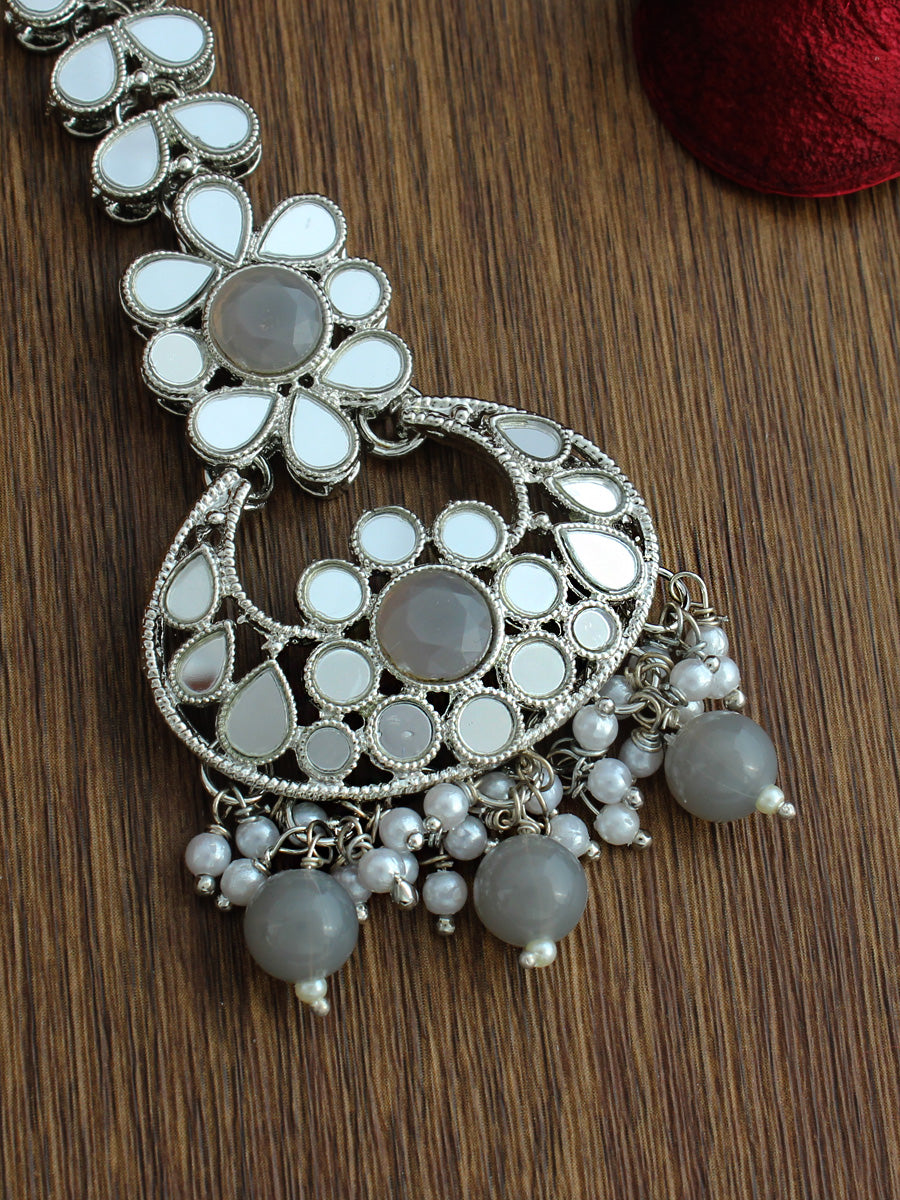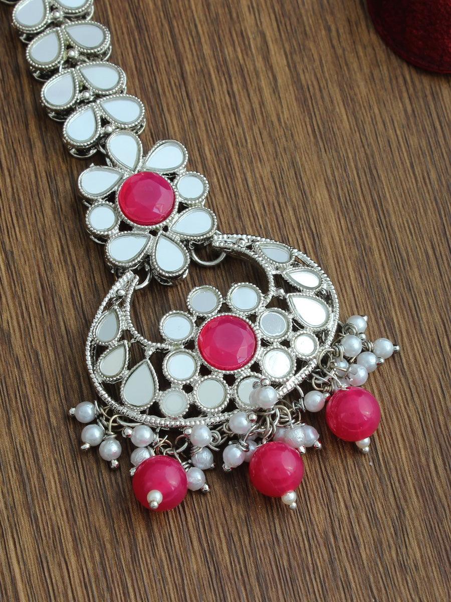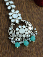The silver/gold tone maang tikka is embellished with mirrors, multicolored stones, and beads, creating a vibrant and stylish accessory. Here are the specifications: