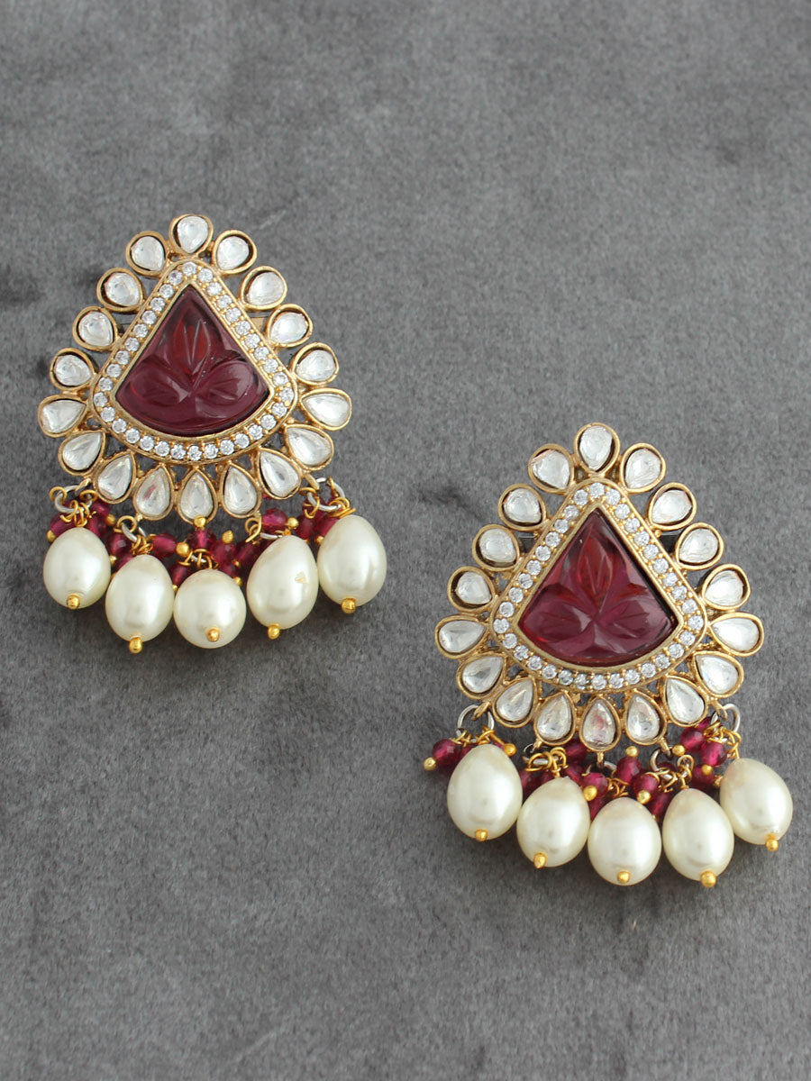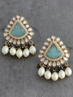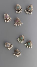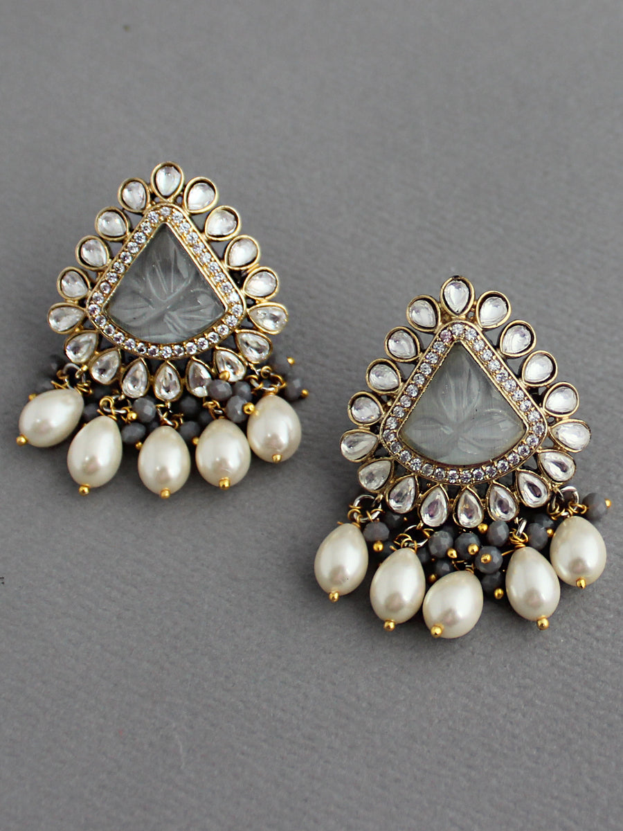 Antique Two-Tone Earrings studded with simulated polki diamond, CZs, pearl, grey, pastel pink, pastel blue, mint green, pink carved stone, and beads. The details of the earrings are as follows: