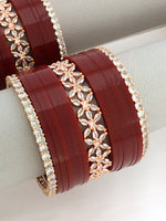 A set of 34 rose gold finish maroon bridal chuda/choora/chooda bangles studded with Simulated Polkis creating an elegant and traditional look.This set combines the vibrant color Maroon with the sparkle of Polkis a creating a luxurious and eye-catching accessory for bridal wear. Crafted from alloy metal and acrylic, it adds a regal touch to the bridal ensemble.