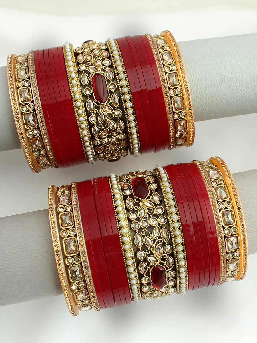 The 66 Pcs Maroon Bridal Chuda/Choora/Chooda Bangle Set is a traditional and ornate accessory, perfect for a bride's wedding attire.