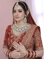 Make a grand entrance on your special day with this stunning Indian bridal (dulhan) jewelry set. Crafted in a radiant gold tone, the set features dazzling simulated Kundans, sparkling CZ stones, lustrous faux pearls, and vibrant maroon and green stones, all accented with delicate beads for an intricate, regal finish. Designed to capture the essence of traditional Indian beauty while ensuring modern comfort, this set includes every essential piece to complete your bridal look—from statement necklaces and earrings to matching maang tikka and bangles. Perfect for weddings, or festive celebrations, this jewelry set transforms every bridal ensemble into a timeless masterpiece, letting you shine with elegance, grace, and sophistication.