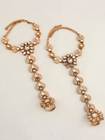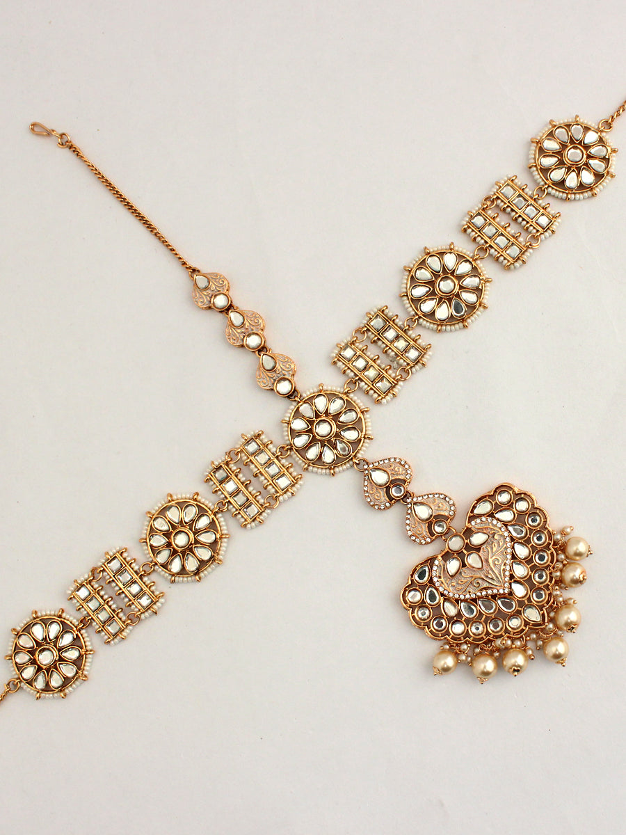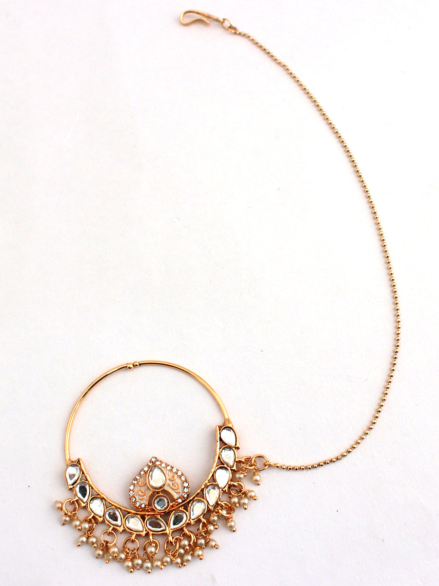 Design: This bridal set features a captivating rose gold finish and is adorned with simulated kundans, CZs, faux pearls, and enamel, creating a perfect blend of traditional and modern elements. The choker necklace with an adjustable cord ensures a snug fit, while the long necklace adds a touch of sophistication. The earrings are designed with post-back findings for secure wear, and the slave bracelets come with chains and adjustable rings for ease of use. The nose ring is adjustable, eliminating the need for piercing, and the sheeshphool mathapatti complements the overall look with its adjustable design.