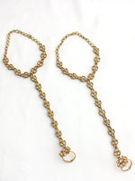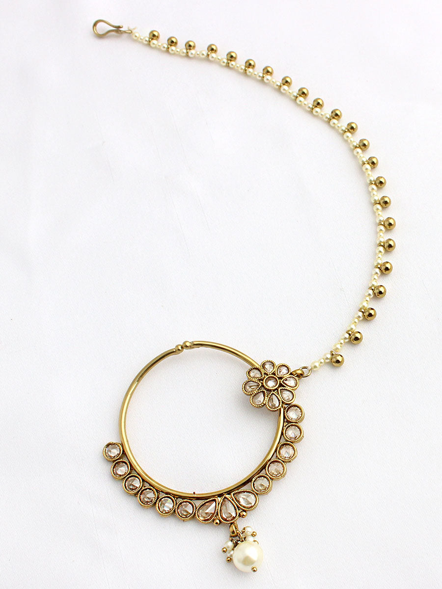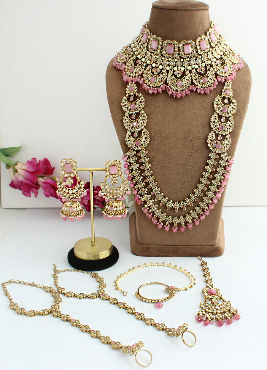 Design: This bridal set boasts a beautiful combination of gold and silver tones, adorned with simulated polkis, pastel pink stones, faux pearls, and beads. The choker necklace, with its adjustable cord, provides a secure and customized fit, while the long necklace adds a touch of grandeur. The earrings are designed for pierced ears and have post-back findings for ease of wear. The slave bracelets come with chains and adjustable rings, ensuring a comfortable fit on the wrists. The adjustable nose ring eliminates the need for piercing, and the maang tika complements the overall ensemble with its design.