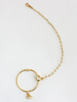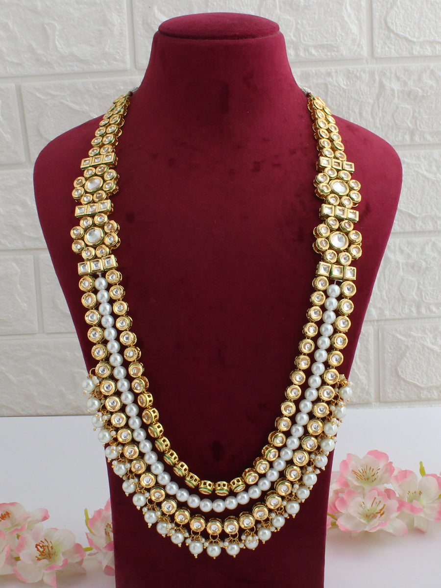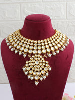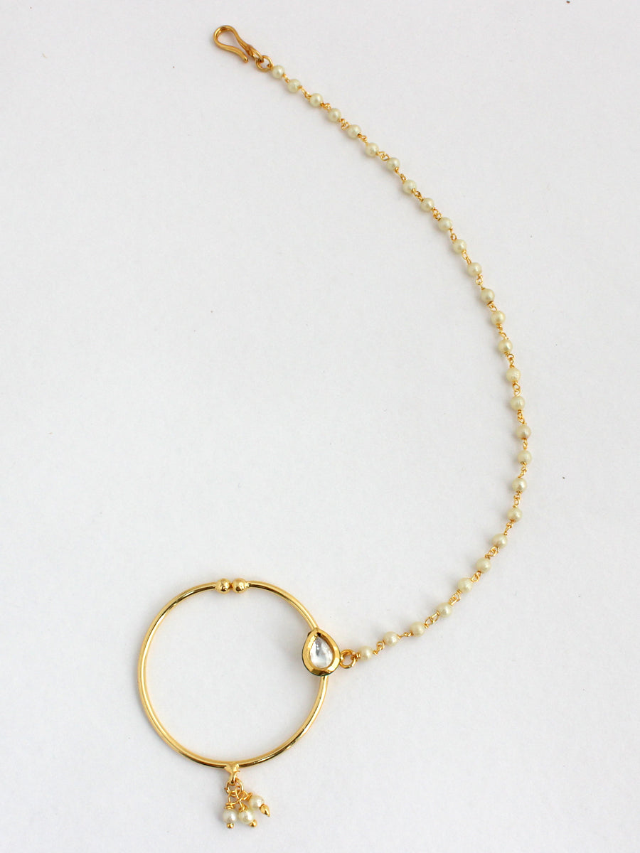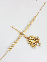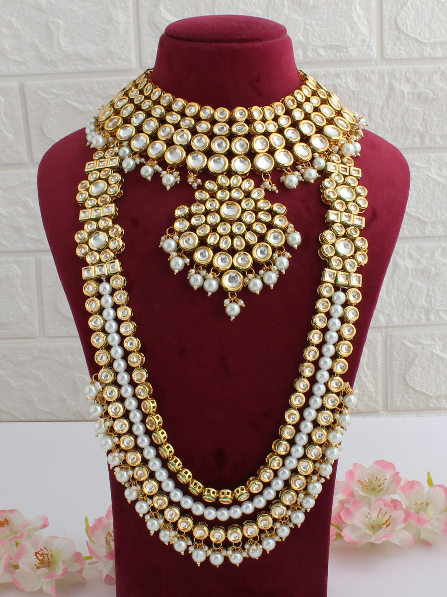 Design: This bridal set is adorned with simulated Kundans and faux pearls, creating a regal and traditional look. The bib necklace and long necklace feature adjustable cords, allowing for a secure and tailored fit. The earrings, designed for pierced ears, boast post-back findings for ease of wear. The sheeshphool mathapatti adds a touch of sophistication, and the hand harness enhances the overall grace. The nose ring completes the ensemble, ensuring a cohesive and stunning bridal look.