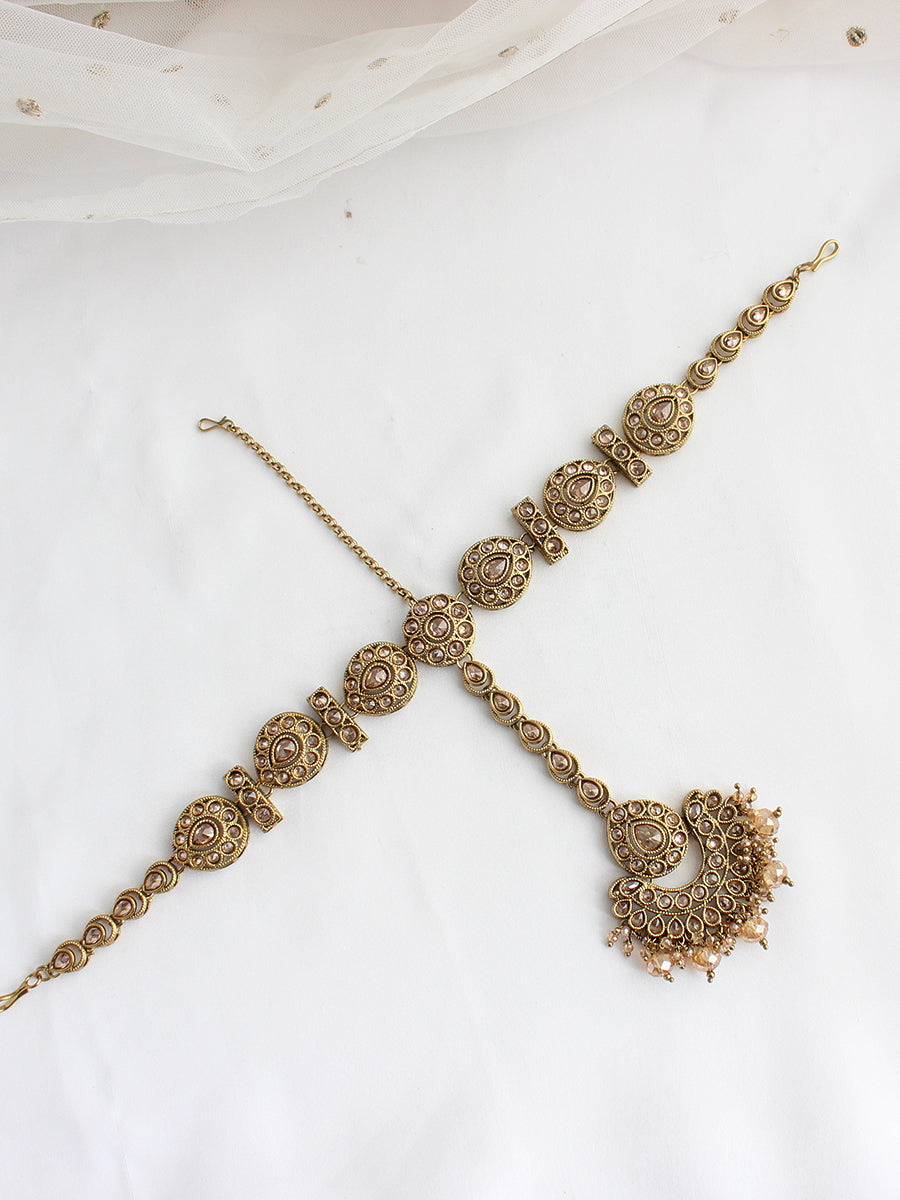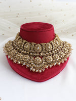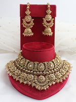 Introducing an exquisite Indian Wedding Bridal (Dulhan) Bridal Set, complete with a choker Necklace, earrings, sheeshphool mathapatti, nose ring and finger ring. This set is adorned with simulated polkis and shiny golden beads for a luxurious and elegant look.