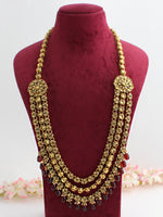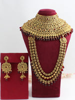 Elevate your bridal look with this exquisite Gold Tone Bridal Set, a harmonious blend of simulated golden Kundan, radiant ruby stones, and intricate beadwork.