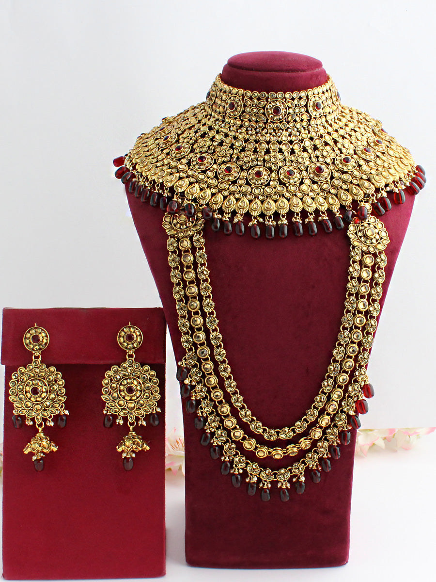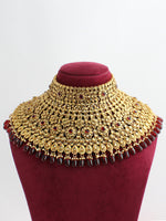 Gold Tone Bridal (Dulhan) Set with Simulated Golden Kundan, Ruby Stones, and Beads: