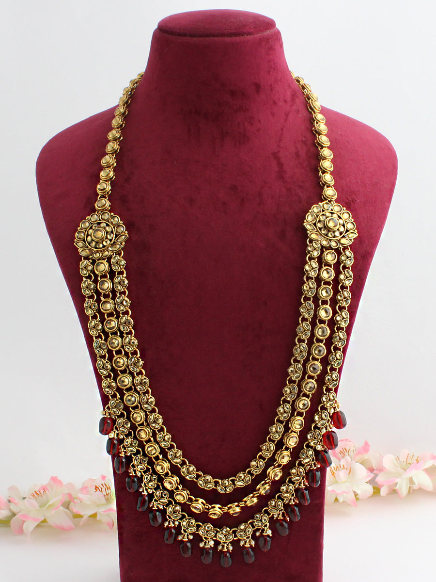 • The necklace features a mesmerizing interplay of simulated golden Kundan and vibrant ruby stones, creating a statement piece for your bridal ensemble.