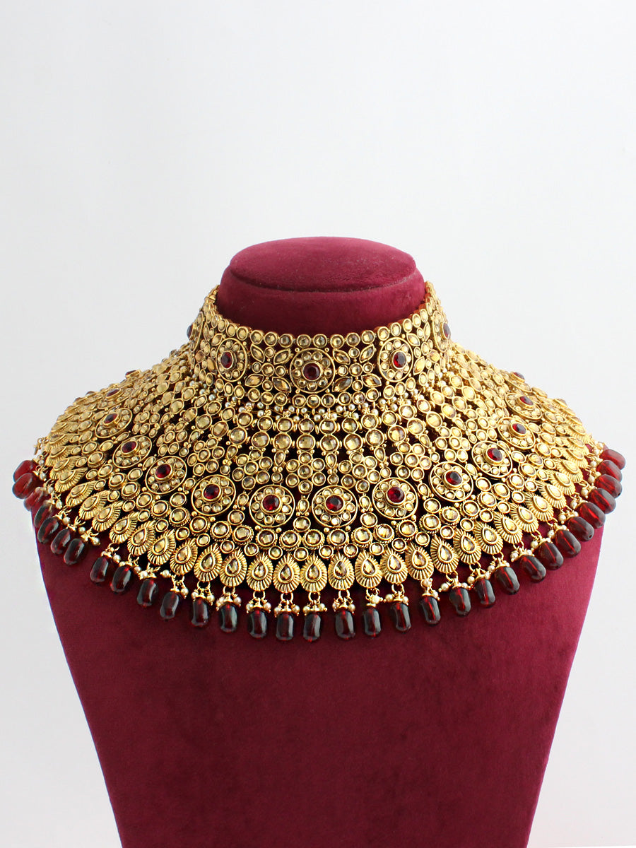 • A stunning choker necklace adorned with simulated golden Kundan and ruby stones.