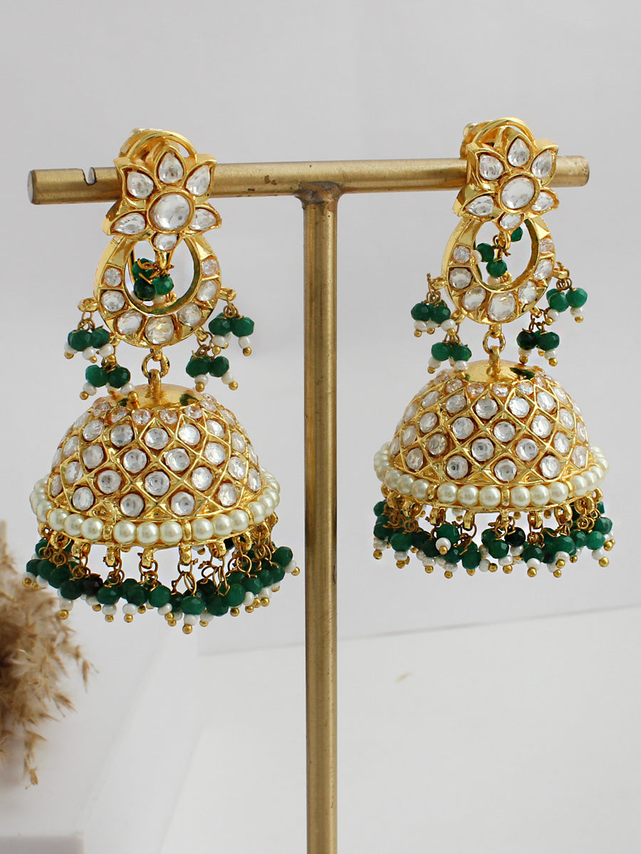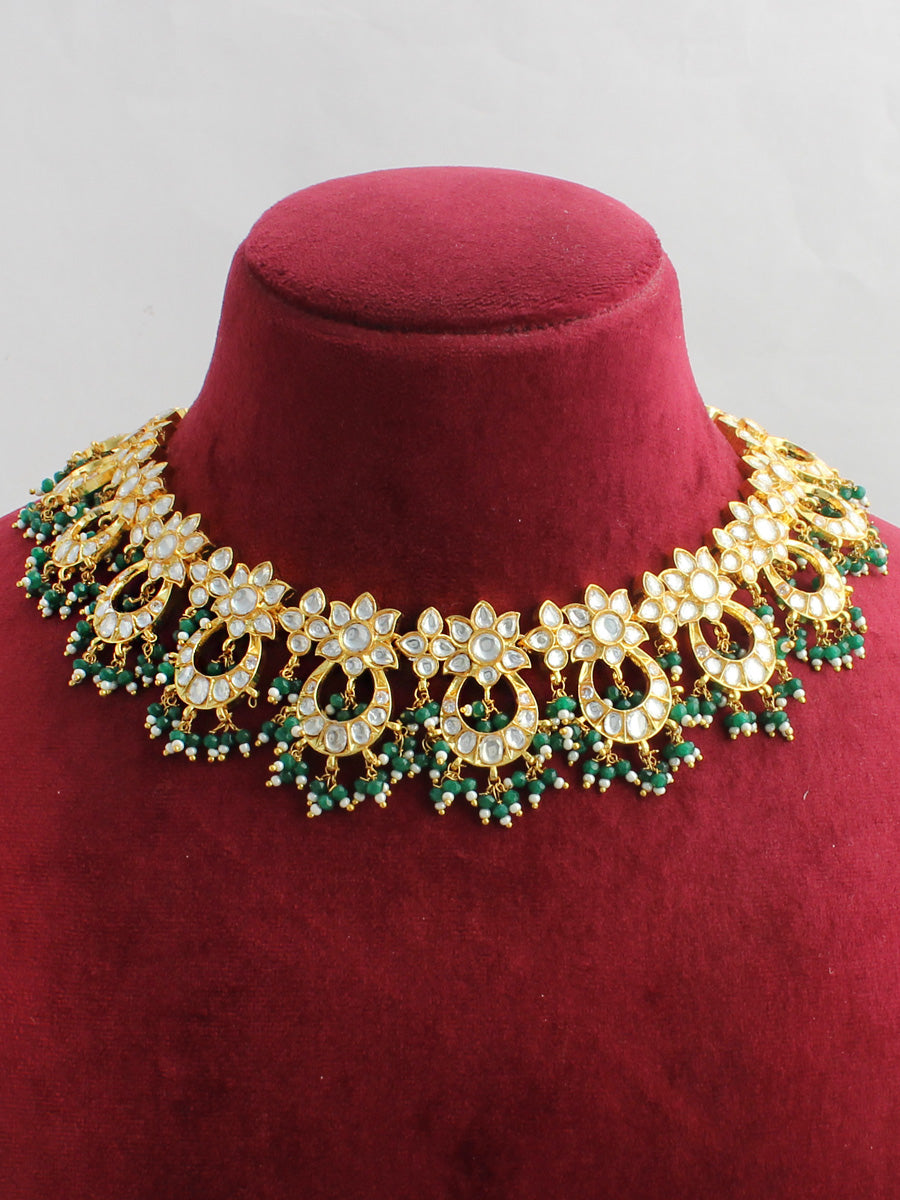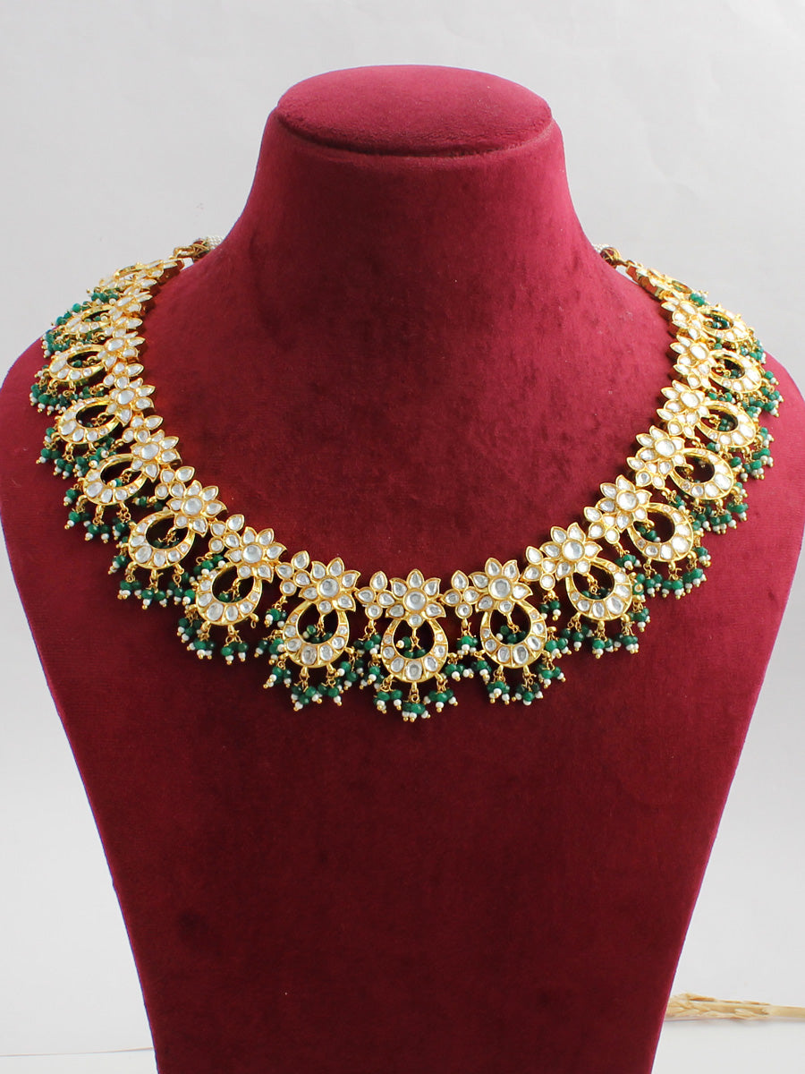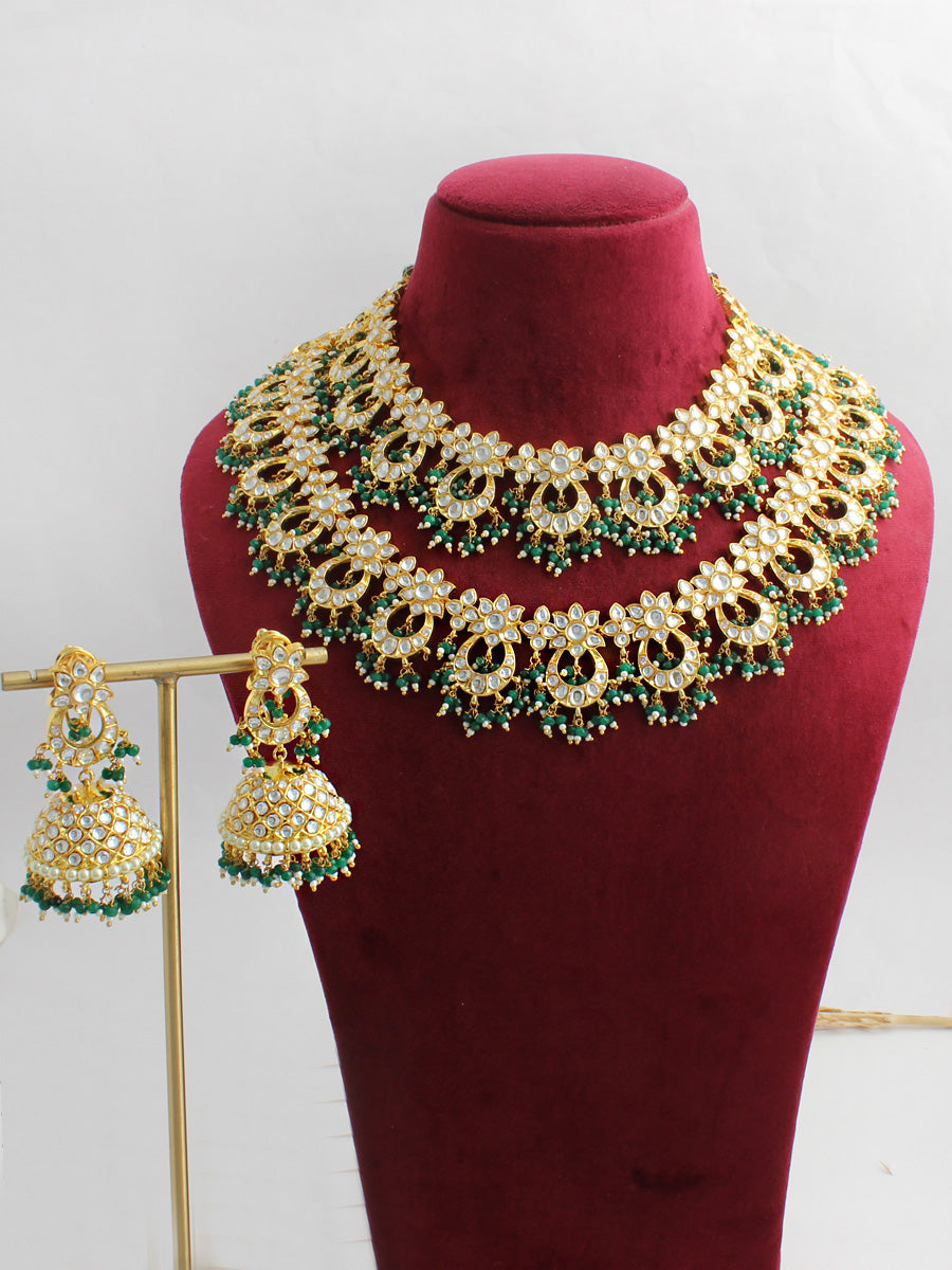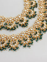 Gold Plated layered necklace set studded with simulated diamond polkis, faux pearls and green beads.