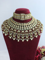 Introducing an exquisite Indian Wedding Bridal (Dulhan) Gold Plated Choker Necklace Set, complete with a bib Necklace, earrings, sheeshphool and hand harness . This set is adorned with simulated kundans, faux pearls and enamel for a luxurious and elegant look.
