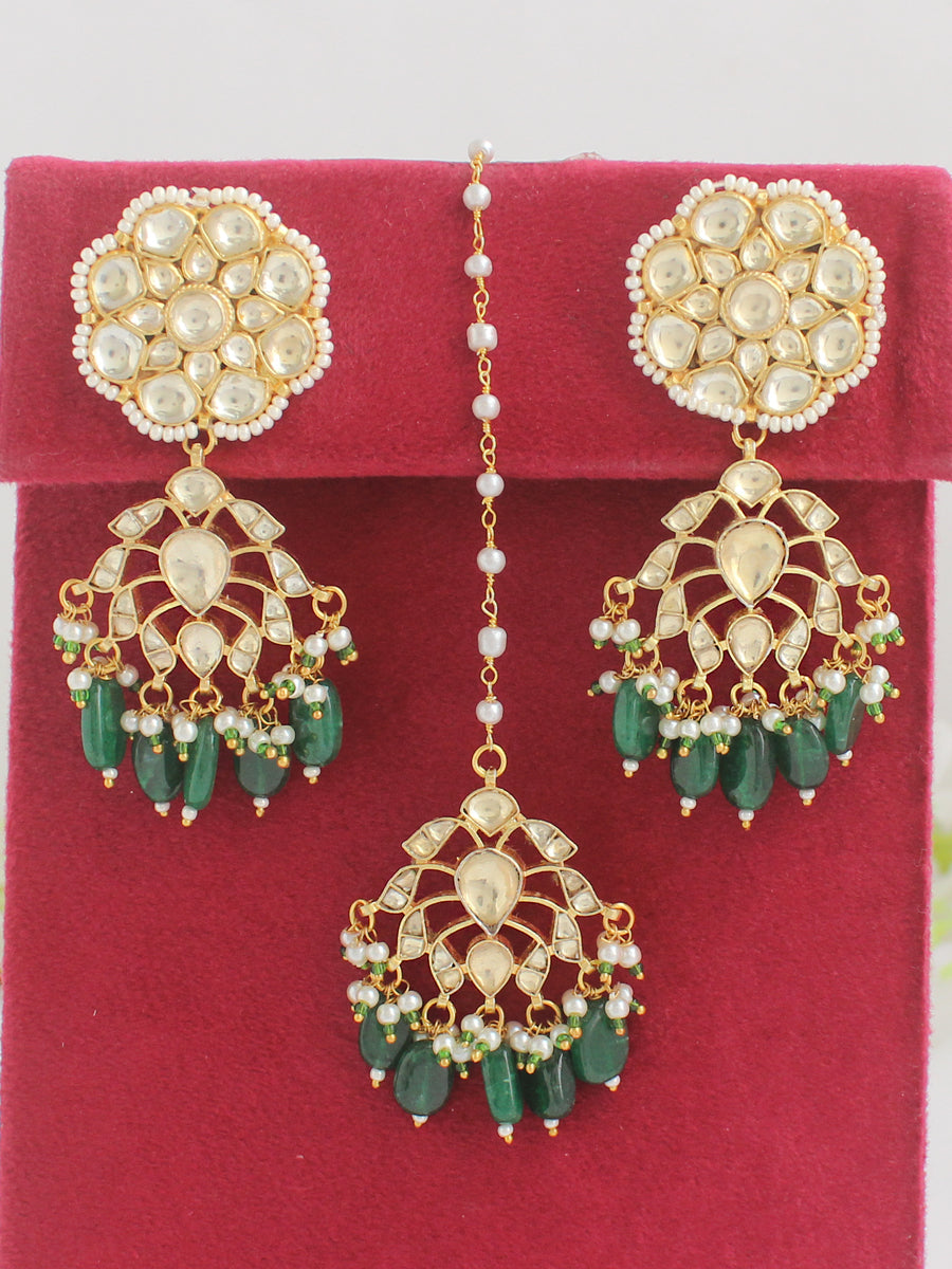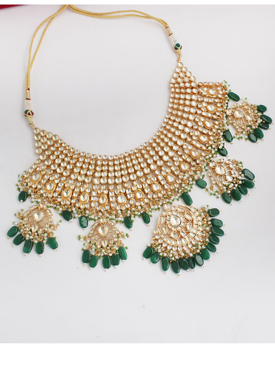 Gold Plated Necklace Set studded with Simulated Kundan, Pearls and Green Beads.