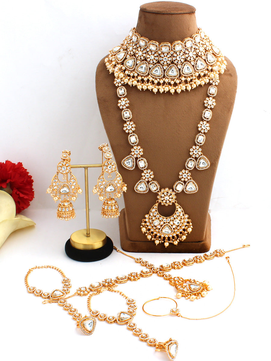 Introducing an exquisite Indian Wedding Bridal (Dulhan) Rose Gold Long Necklace Set, complete with a choker, earrings, sheshphool, hand harness, and nose ring. This set is adorned with simulated kundans, CZs, and faux pearls for a luxurious and elegant look.