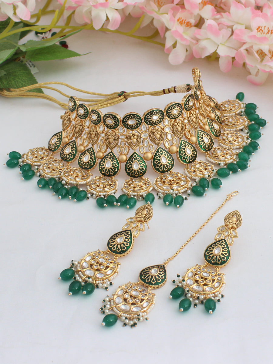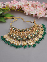 - The gold-plated necklace, measuring 8 1/4", exudes regality with its simulated polki diamonds, faux pearls, and intricate green beadwork.
