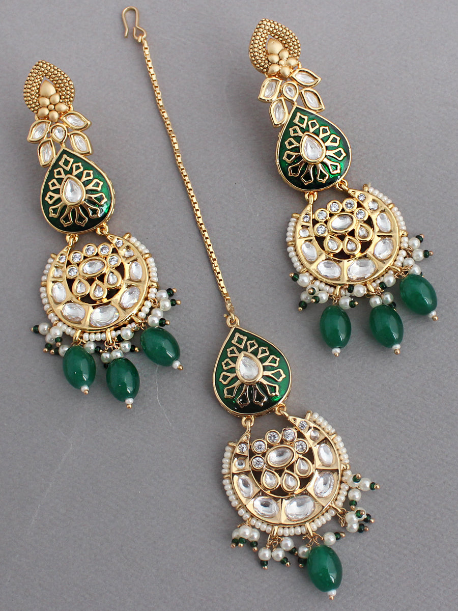 Elevate your bridal ensemble with our exquisite Gold-Plated Bridal Necklace Set. This set is a testament to timeless beauty, adorned with simulated polki diamonds, faux pearls, green beads, and delicate enamel detailing.