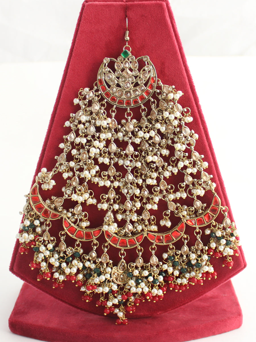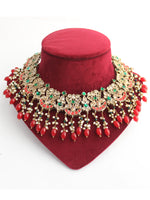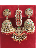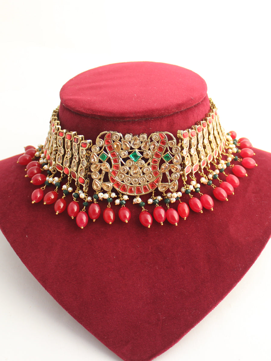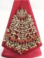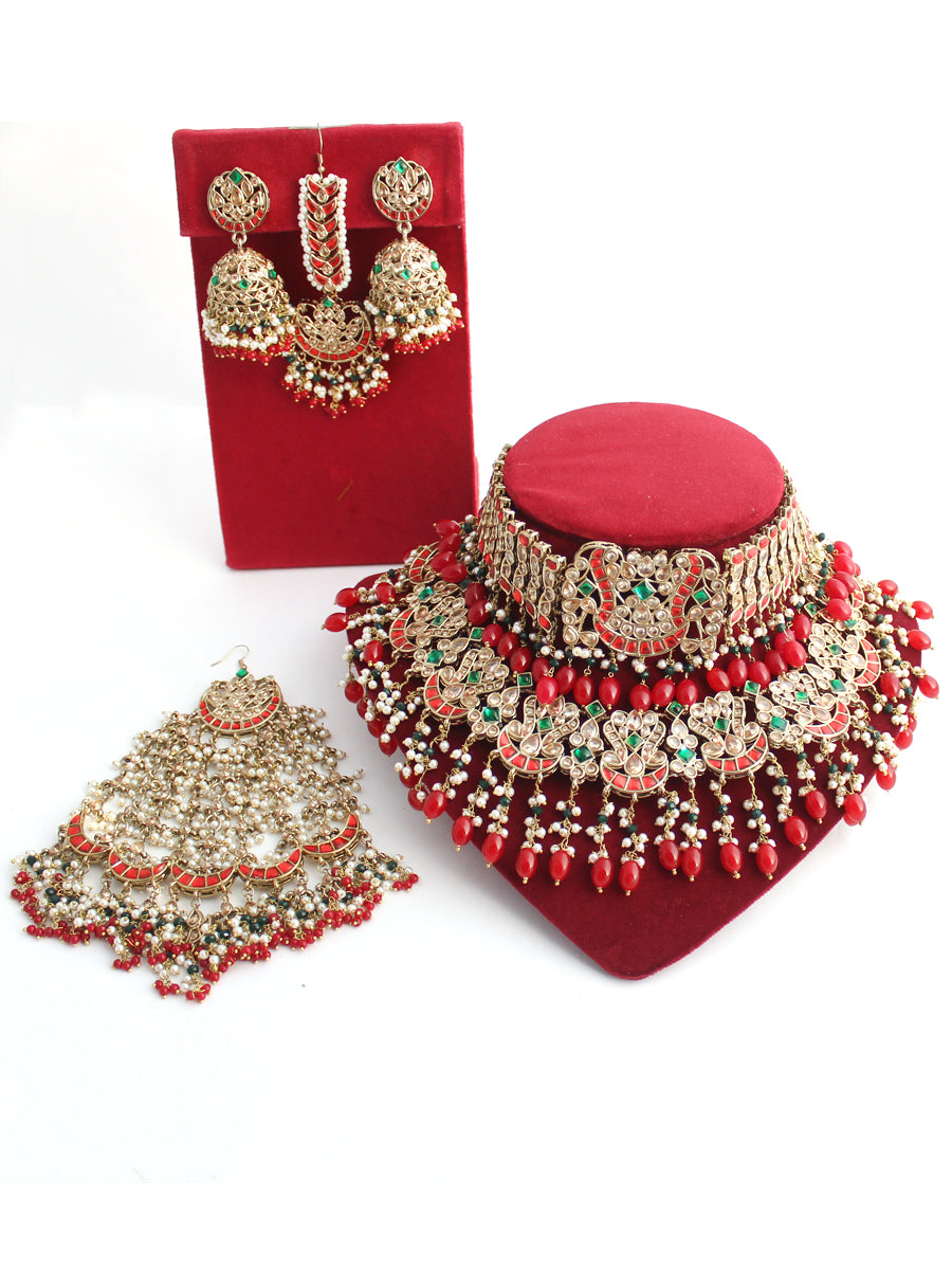 Design: This bridal set is adorned with simulated polki, maroon and green stones, and beads, creating a stunning visual impact. The bib necklace and choker necklace, with adjustable cords, offer a customized and secure fit. The earrings, designed for pierced ears, feature post-back findings for ease of wear. The maang tikka adds a traditional touch with its elegant design, and the jhoomer completes the ensemble with its captivating presence.