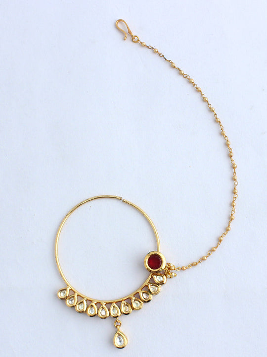 The Gold-Plated Nose Ring, studded with simulated polki, faux pearls, ruby pink, and green beads, is a stunning and versatile accessory. Here are the details: