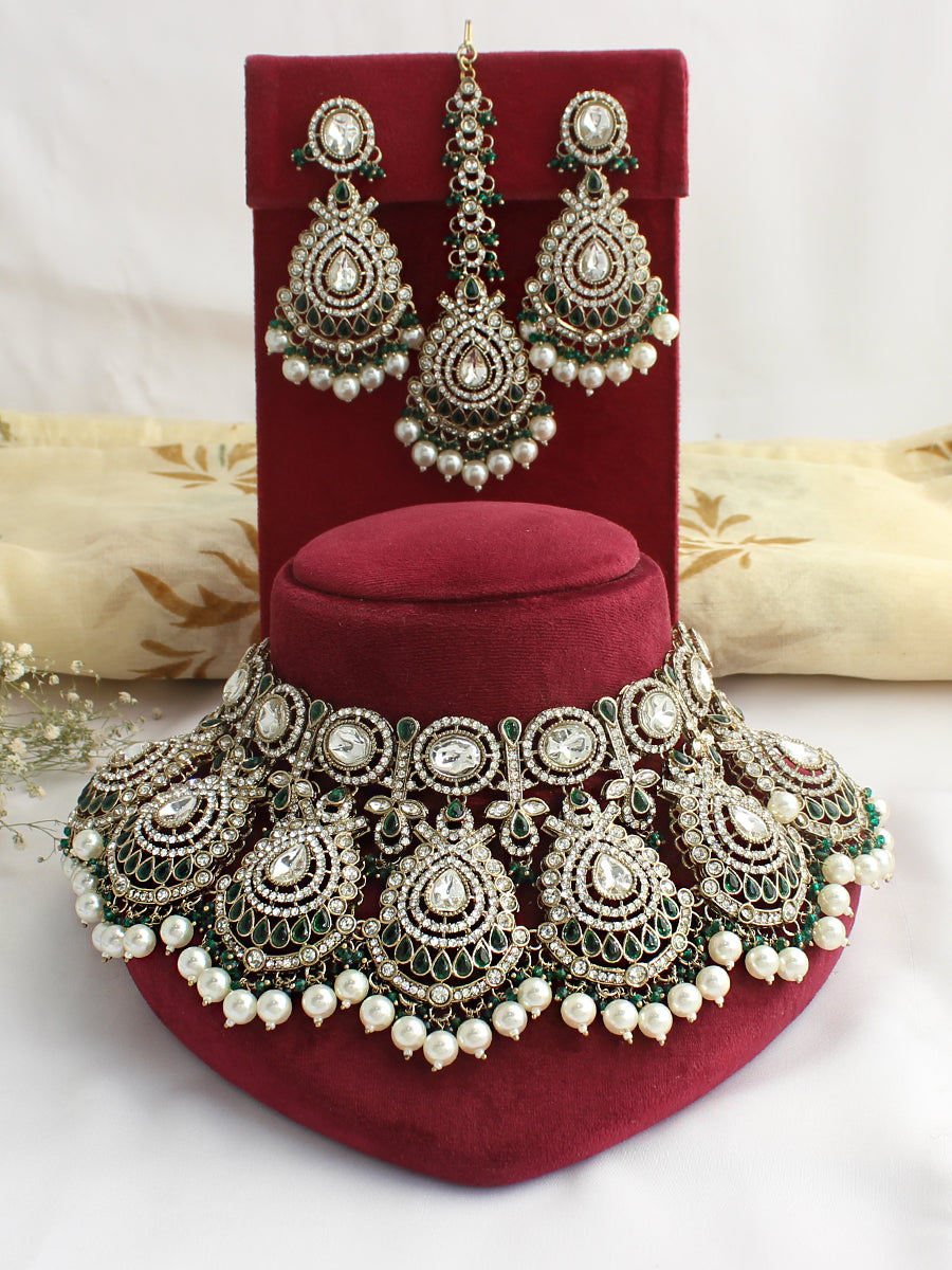 Make a grand entrance on your special day with this stunning Indian bridal (dulhan) jewelry set. Crafted in a radiant gold tone, the set features dazzling simulated Kundans, sparkling CZ stones, lustrous faux pearls, and vibrant maroon and green stones, all accented with delicate beads for an intricate, regal finish. Designed to capture the essence of traditional Indian beauty while ensuring modern comfort, this set includes every essential piece to complete your bridal look—from statement necklaces and earrings to matching maang tikka and bangles. Perfect for weddings, or festive celebrations, this jewelry set transforms every bridal ensemble into a timeless masterpiece, letting you shine with elegance, grace, and sophistication.