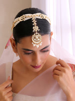 This headpiece is a beautiful addition to bridal attire, featuring intricate details and a combination of simulated polki diamonds and pearls for a regal look.