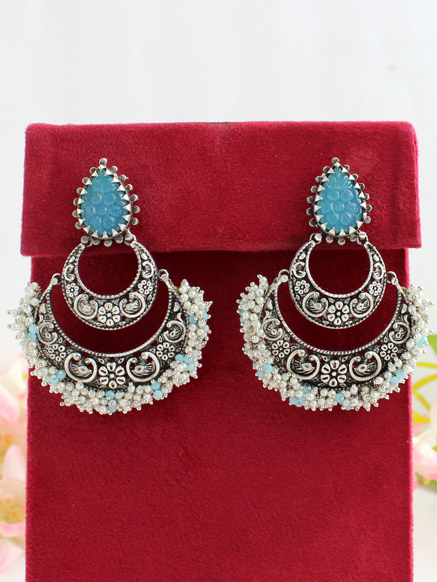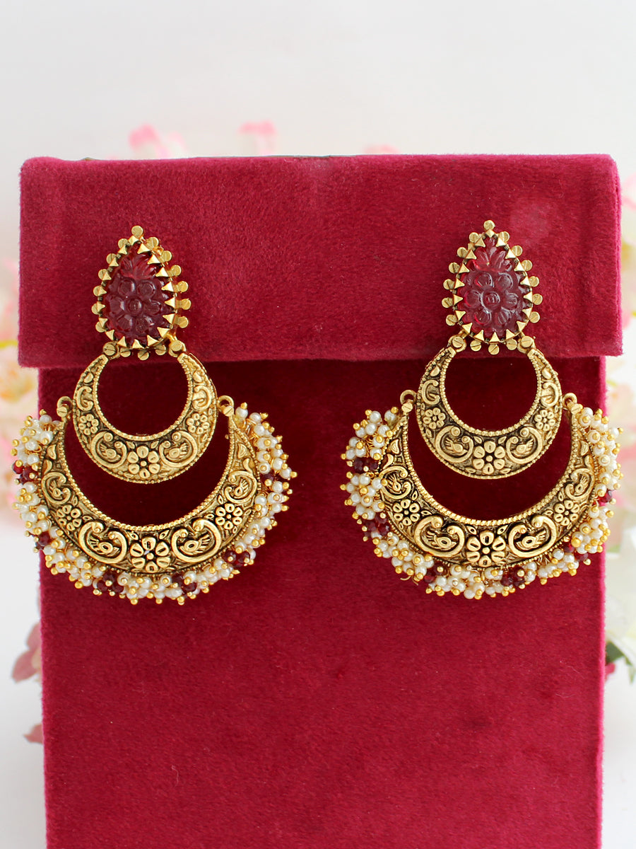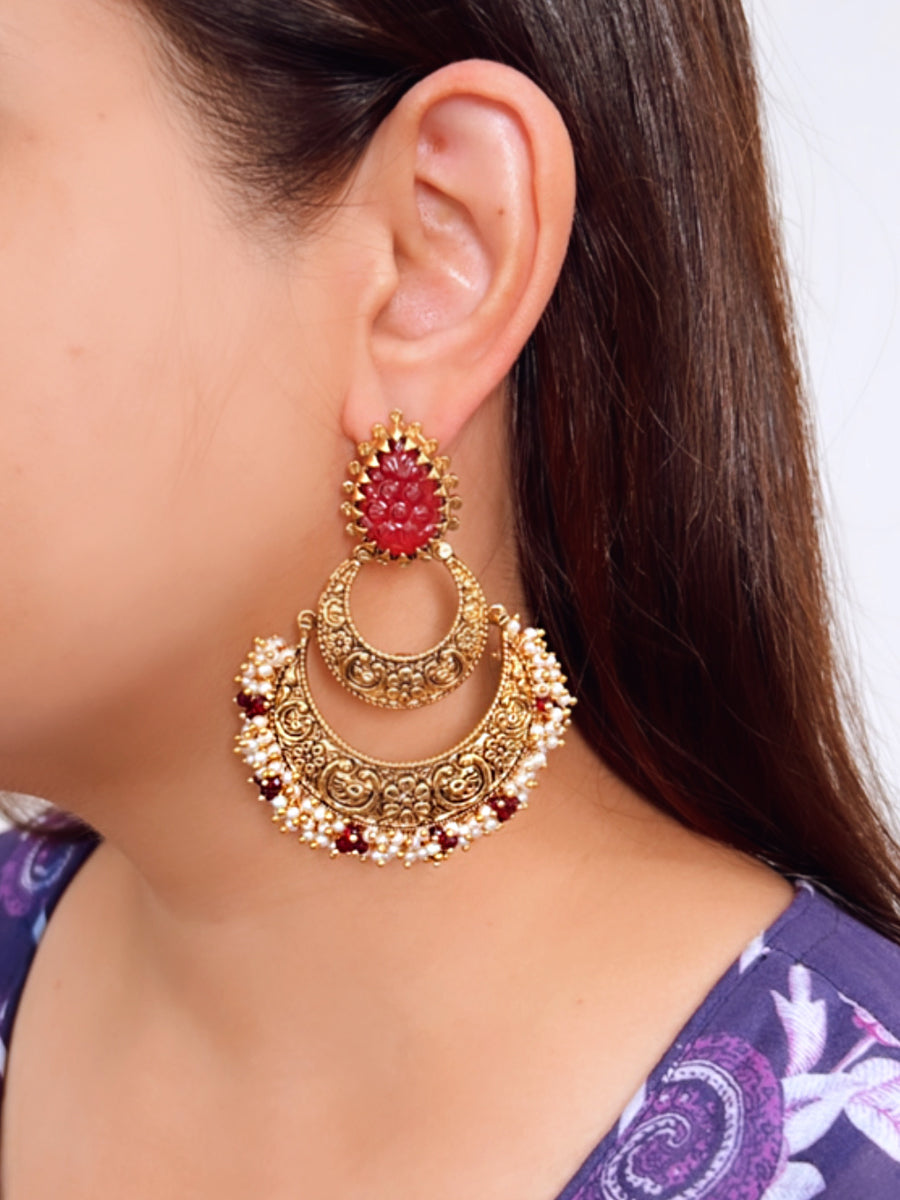 - Presenting our Antique Gold / Silver Tone Chandbali Earrings, adorned with Maroon, Craved Stone and Pearl beads for a regal and traditional touch. Crafted on a base of high-grade alloy metal, Each piece tells a story of tradition, craftsmanship, and devotion, capturing the essence of timeless beauty.