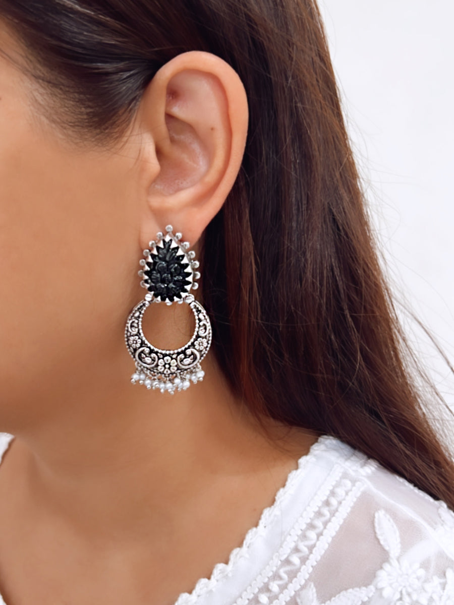 - Presenting our Gold / Silver Tone Earrings, adorned with Simulated Pstel Pink, Black Carved stones and Pearl beads for a regal and traditional touch. Crafted on a base of high-grade alloy metal, this pair beautifully blends antique charm with contemporary design, making it a statement accessory that adds elegance to any occasion.