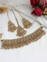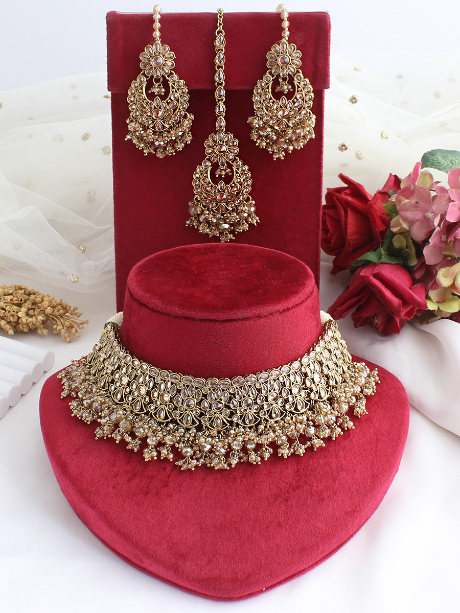 Introducing our captivating antique gold necklace set, featuring a stunning choker necklace, earrings and tikka. Adorned with simulated polkis, Czs and crystal beads for a luxurious and elegant look, Crafted on a base of high-grade alloy metal. The adjustable cord ensures a comfortable fit for all neck sizes, and the matching earrings and tikka complete the set. this set seamlessly combines classic elegance with contemporary design, making it a versatile and stunning addition to your jewelry collection.