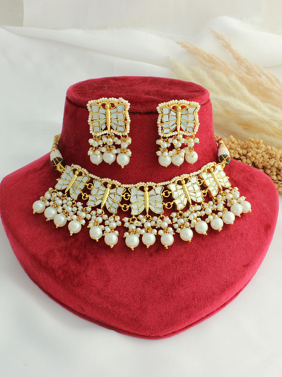 Introducing our elegant Gold-Plated Butterfly Choker Necklace Set, adorned with natural mother of pearls and beads for a regal and captivating look.