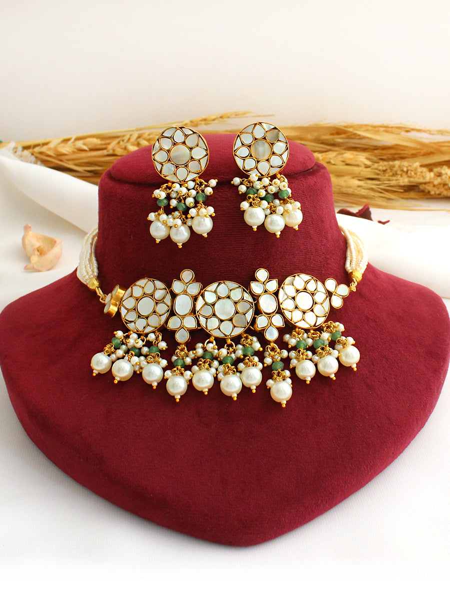 The Gold Tone Choker Necklace Set, adorned with natural mother of pearls and beads for a graceful and timeless look. The adjustable cord ensures a comfortable fit, and the post-back earrings provide ease of wear. This set is perfect for making a statement and adding a touch of glamour to your ensemble. The Mother of pearl material's iridescence and smooth texture make it versatile and suitable for both casual and formal occasions.