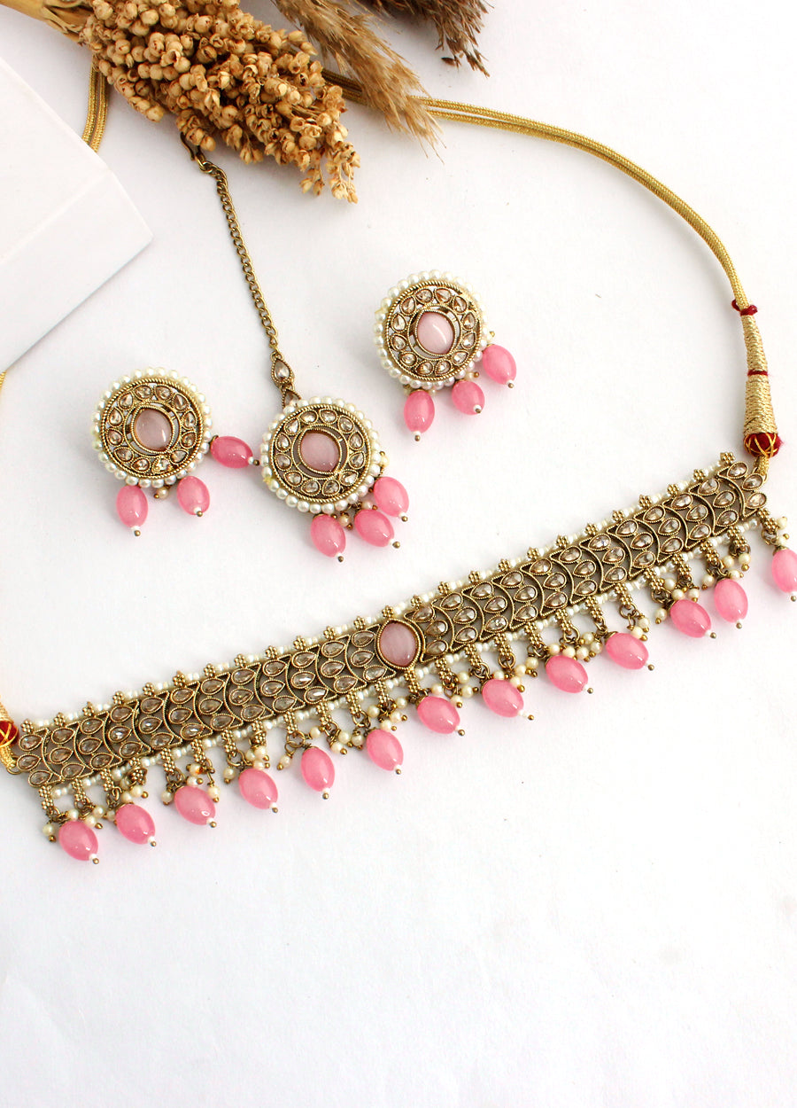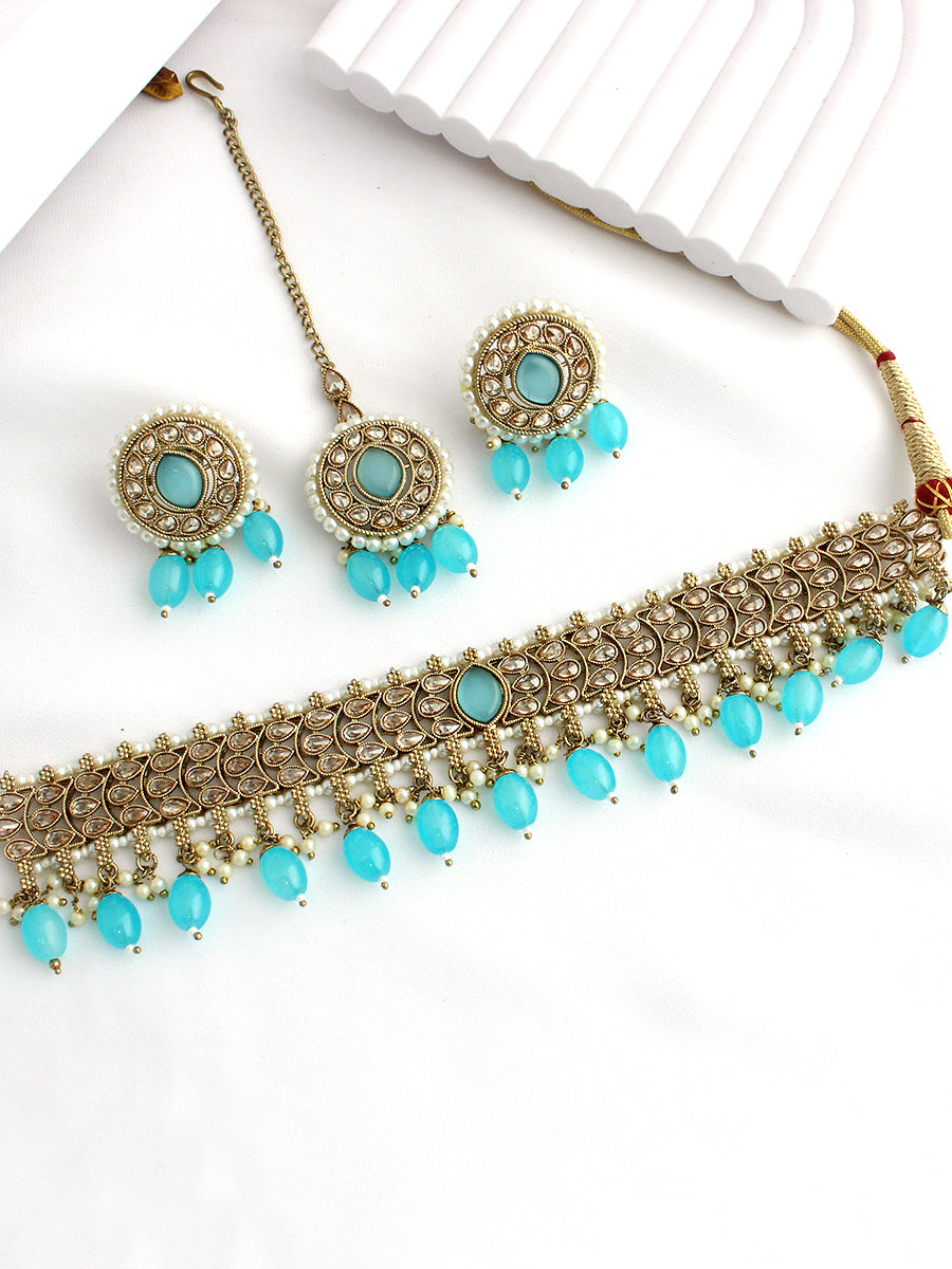 Gold Tone Choker Necklace Set studded with Simulated Polki Black, Blue, Green, Mint Green, Pastel Pink, Yellow, Lavender Stones and Beads.