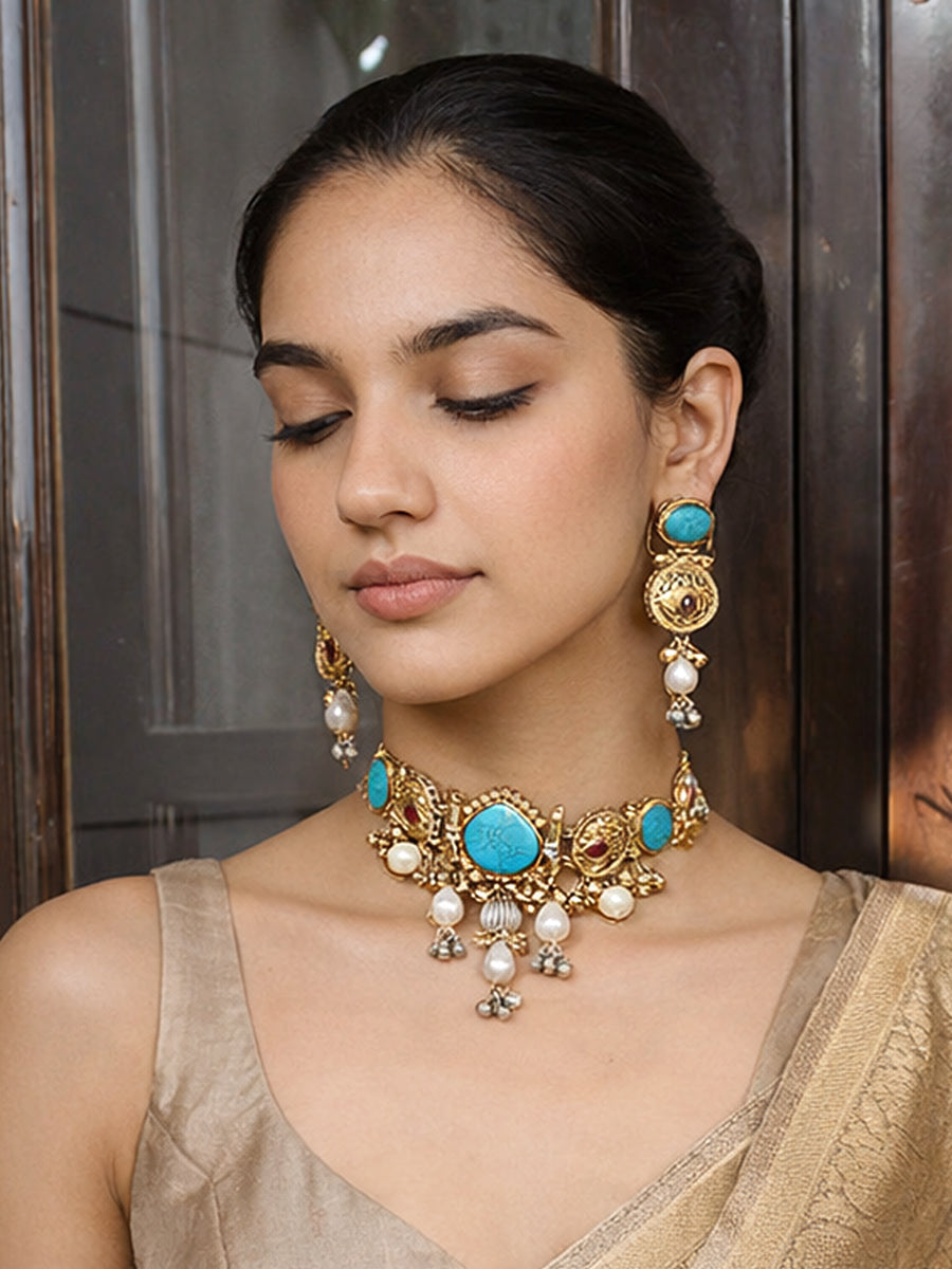 Add a touch of timeless elegance to your ensemble with the Maya Choker Necklace Set. This exquisite piece features an antique gold-tone choker intricately adorned with simulated spider turquoise and hot pink stones, creating a striking contrast that catches the eye. The design is further enhanced with delicate dangling pearls and shimmering gold & silver beads (ghungroos), which add a soft, rhythmic jingle as you move.