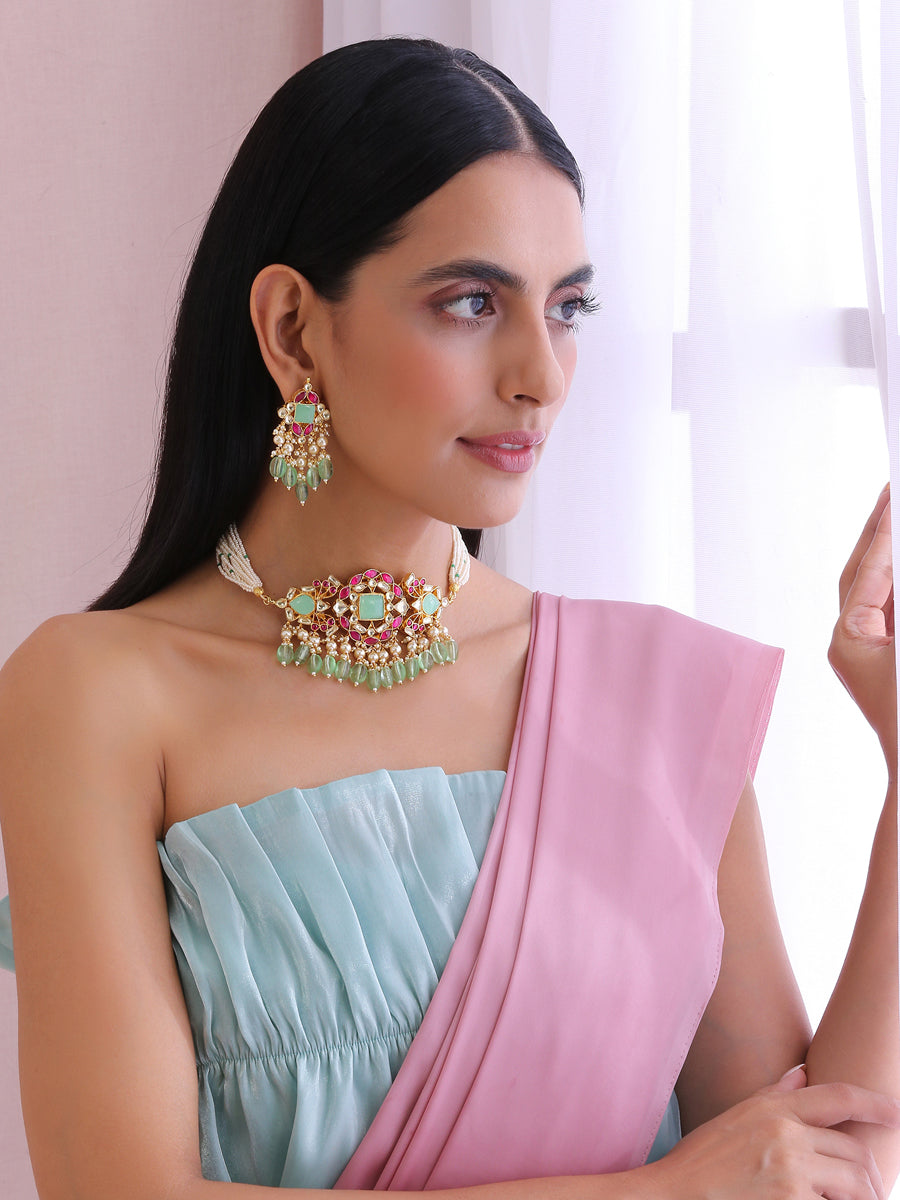 Gold Plated Choker Necklace Set Studded with Simulated Kundan, Green, Hot Pink, Mint Green Stones, Faux Pearl and Beads