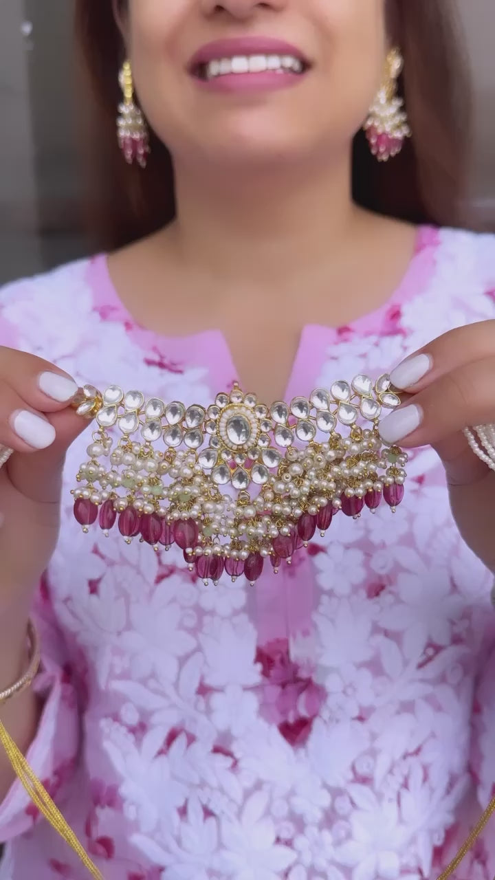 The gold-plated choker necklace set is a stunning piece adorned with simulated Kundans and multi-color beads. Here are the specifications: