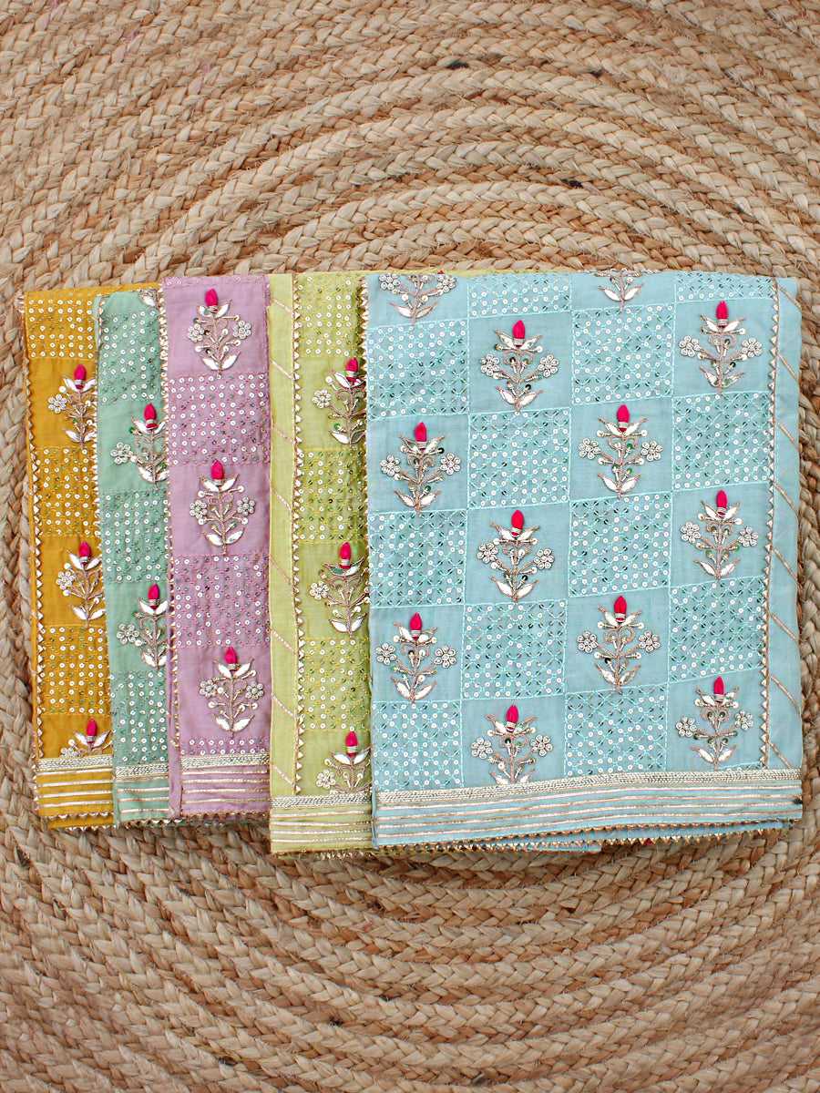 Gorgeous chanderi unstitched suit, having beautiful embroidery with gota lace, pearls, dabka work. Paired with zari & bandhej crinkled banarasi dupatta featuring with gota lace border. with a santoon fabric bottom.