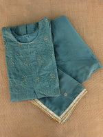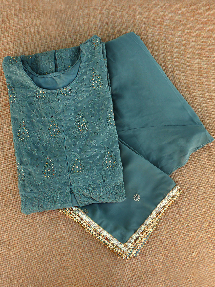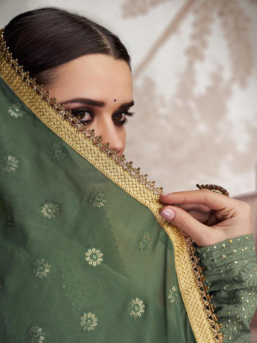 Olive Green Lucknowi Embroidered Unstitched Floor Length Anarkali Suit Features A Georgette Kameez with Santoon Inner, Georgette + Santoon Bottom and Embroidered Dupatta.
