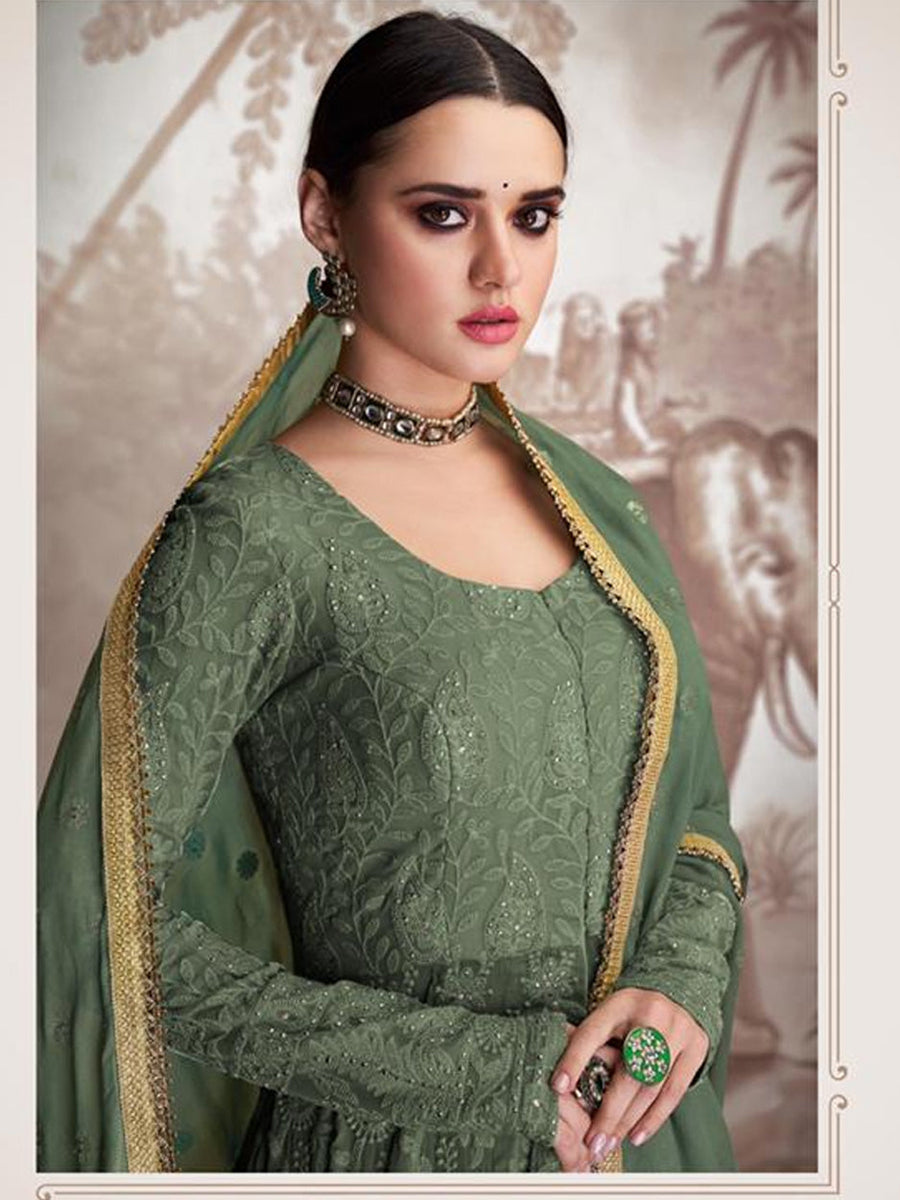 Mahira Olive Green Georgette Lucknowi Chikankari Embroidered Anarkali Suit
