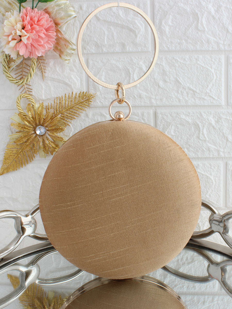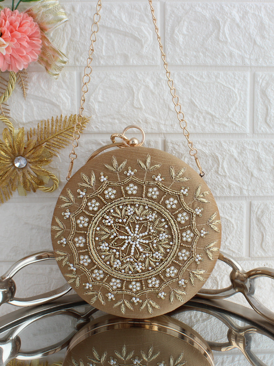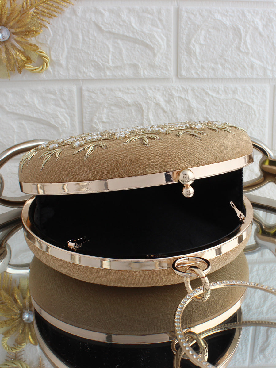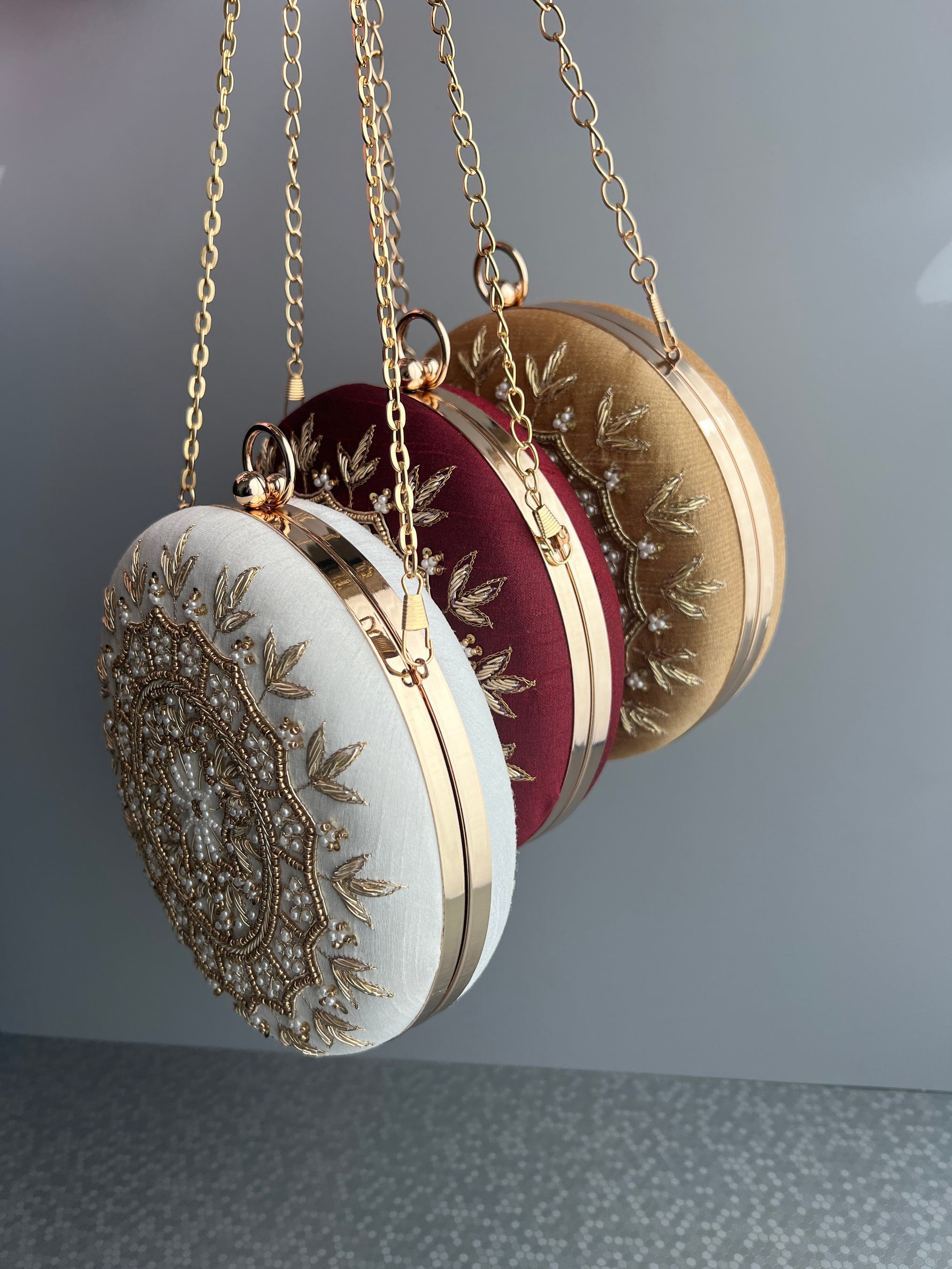 This round shaped clutch bag box adorned with Pearls, golden beads, zardozi salma embroidery, a metal frame. The clutch comes with a detachable handle and an optional chain shoulder strap. This collectible statement accessory fits in your valuables like a Smartphone, makeup, keys, currency and cards.