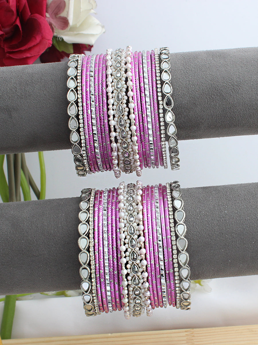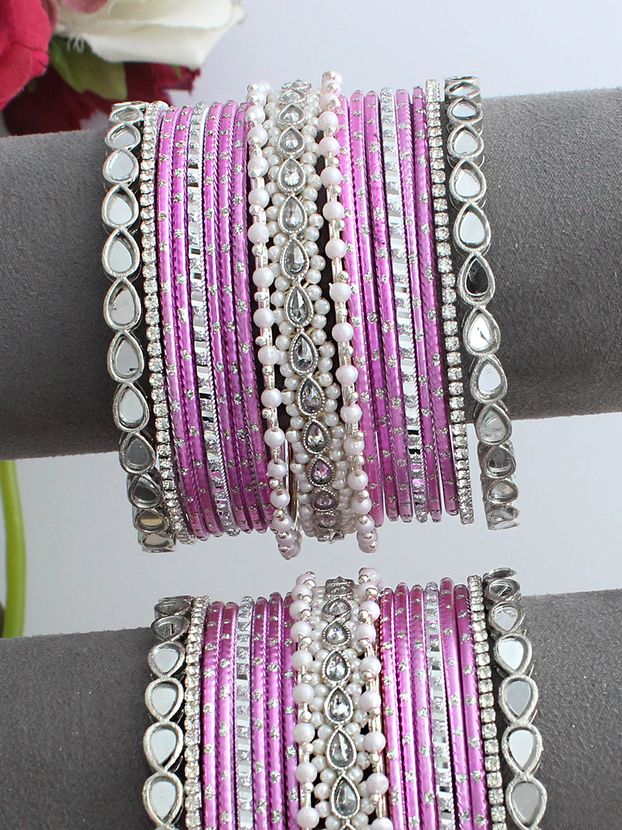 Introducing our 38-PC (2 Set) Pink Bangle Set, a stunning collection that combines elegance with traditional charm. This exquisite set is studded with Mirrors and Czs , and Faux Pearl offering a timeless touch to any outfit.